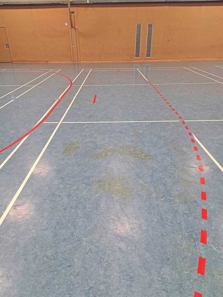 Ein Handballverein sollte das benutzte Handballharz selbst vom Boden entfernen. Das ging schief und es entstanden braune Verfärbungen – eine mögliche Verseifung des Linoleums. Die alte PU-Beschichtung wies aber noch genügend Resistenz auf.