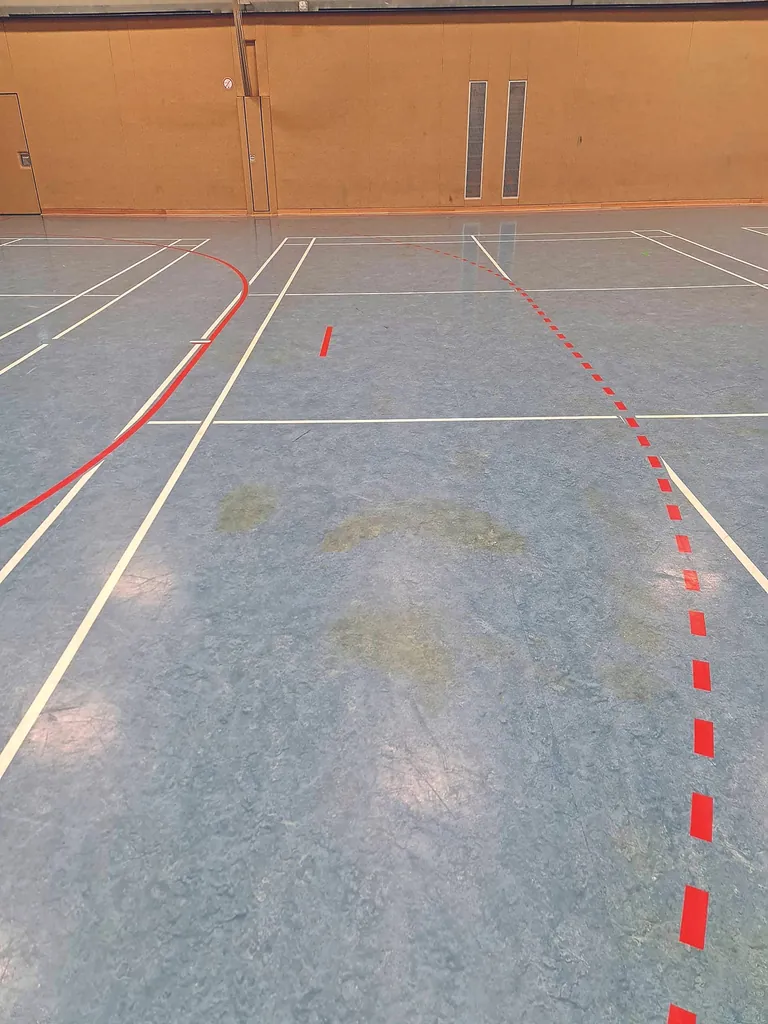 Beim Ortstermin stellte sich heraus, dass in der Sporthalle ebenfalls ein Handballverein trainiert und auch seine Ligaspiele durchführt. Die Handballer nutzen dabei Handballharz (erhöht die Griffigkeit des Balles), dessen auf dem Boden befindliche Überreste jedoch vom Verein selbst zu entfernen sind.
