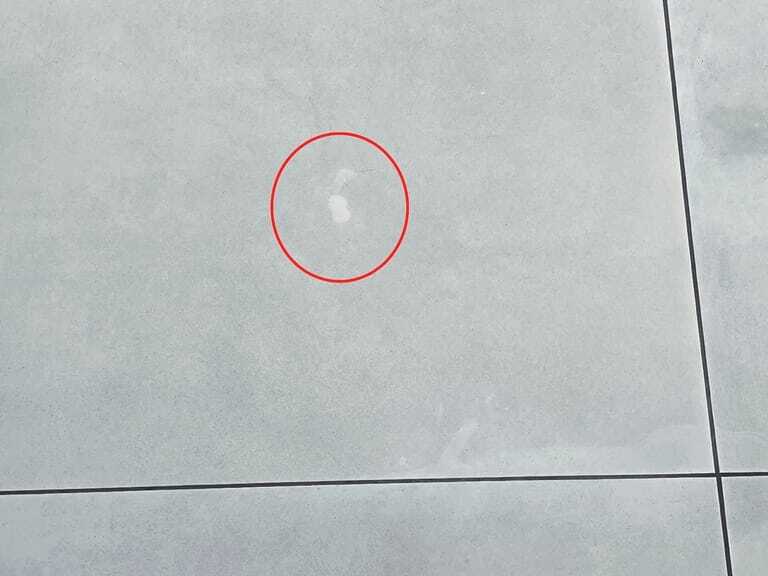 Aktueller Schadensfall: Bei vergrauten Feinsteinzeugfliesen liegt die Vermutung nahe, dass eine Schlechtleistung in der Unterhaltsreinigung und falscher Textileinsatz vorliegen. In diesem Fall stellte sich jedoch heraus, dass sich in erheblichem Umfang Epoxidharz auf der Oberfläche befand.