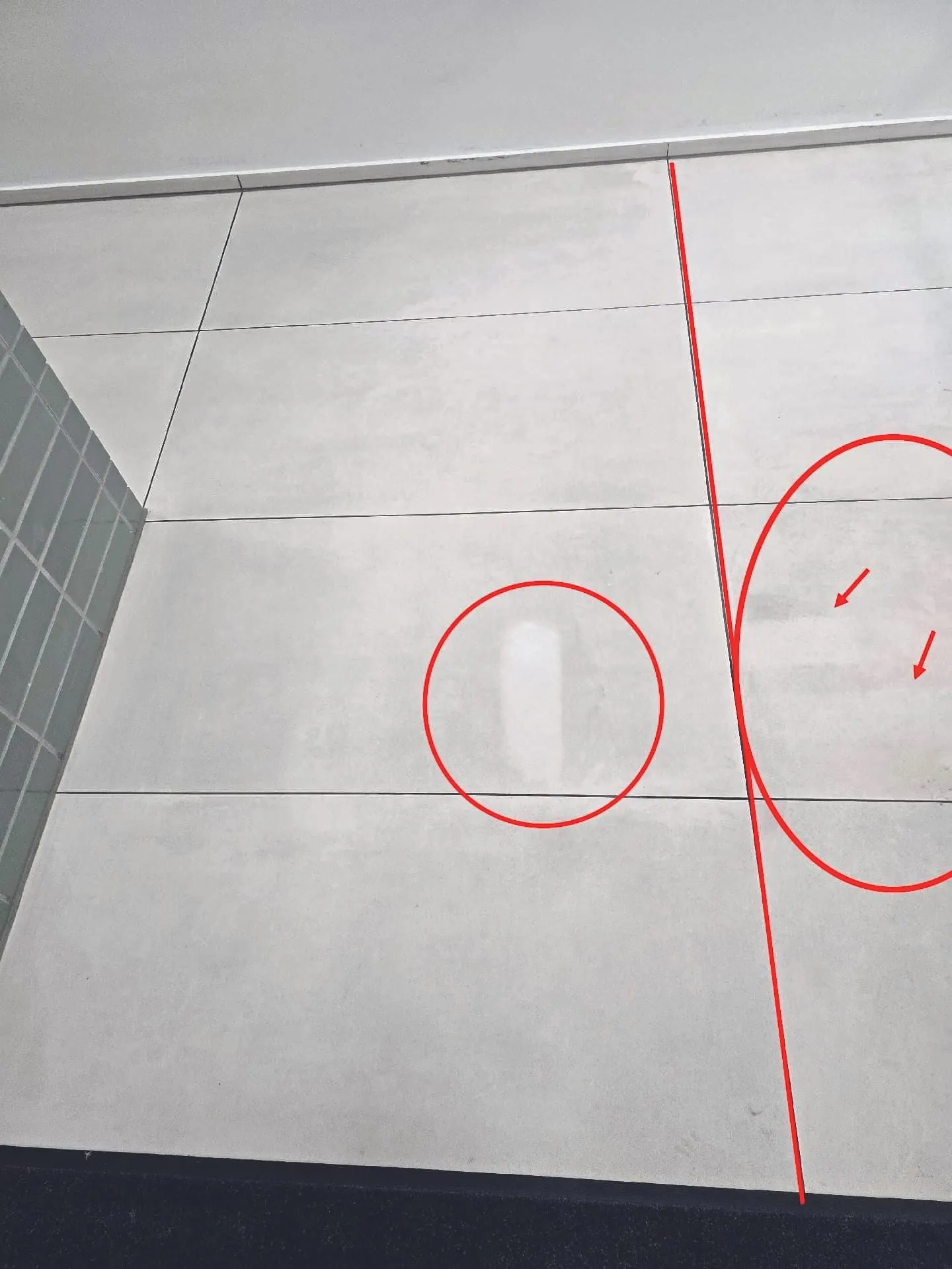 Im Zuge mehrerer Ortstermine und Prüfung möglicher Ursachen wurde festgestellt, dass es sich bei den Rückständen um nicht vollständig entfernte Epoxidharzreste handelte, die während der Verfugung in der Bauphase auf die Oberfläche der Fliesen gelangt waren. Die ursprünglich transparenten Rückstände des Epoxidharzes hatten sich im Laufe der Zeit dunkel verfärbt. Dies führte nicht nur zu einem optischen Mangel, sondern auch zu einer Herausforderung im Reinigungs- und Unterhaltsprozess.