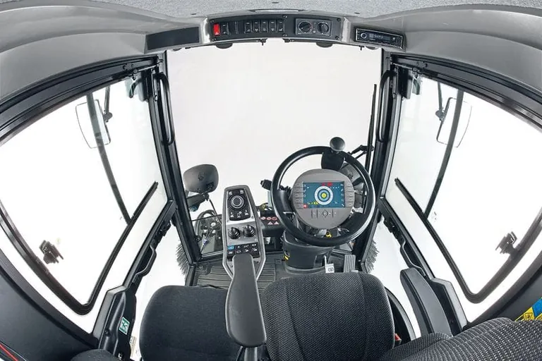 Die Jury überzeugte auch die geräumige Fahrerkabine mit 360-Grad-Rundumblick. Die intuitive Bedienung über das Multifunktions­display in der Mitte des Lenkrades erlaubt eine sichere Steuerung. Alle notwendigen Einstellungen werden auf einen Blick erfasst – ebenso die Bilder der Rückfahr- und Saugmundkamera. Selbst­erklärende Symbole erleichtern die Anpassung der Parameter wie die Besendrehzahl. Ausstattungsmerkmale wie variabel einstell­bare Lenksäulen, Fahrersitze mit Lordosestütze und ergonomische Armlehnen ermöglichen eine gesunde, ermüdungsfreie Sitzposition.