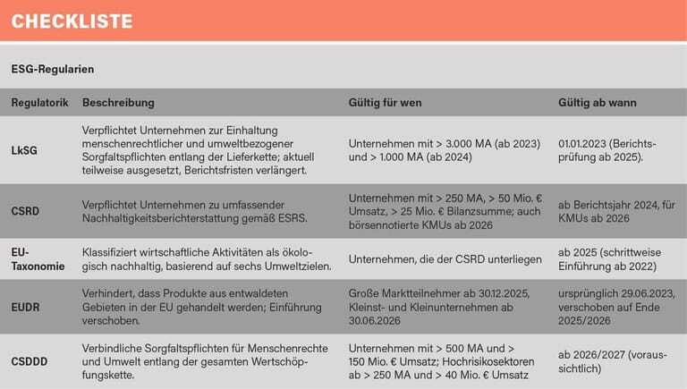 Gab es bis vor wenigen Jahren praktisch keine gesetzlichen Verpflichtungen für Unternehmen im Themenfeld ESG, gibt es heute ein regelrechtes Feuerwerk an Regularien, von denen viele sogar fast zeitgleich in Kraft treten. Darunter fallen insbesondere das Lieferkettensorgfaltspflichtengesetz – kurz LkSG (gültig ab 1. Januar 2024, aktuell teilweise ausgesetzt) –, die EU-weite Nachhaltigkeitsberichtspflicht Corporate Sustainability Reporting Directive (kurz: CSRD; für die meisten Unternehmen gültig für das Berichtsjahr 2025, allerdings in Deutschland noch nicht in nationales Recht umgesetzt), die EU-Taxonomie-Verordnung (gültig ab 2025 für Unternehmen, die unter die CSRD fallen) sowie für bestimmte Unternehmen zusätzlich noch die EU-Entwaldungsverordnung (EUDR).