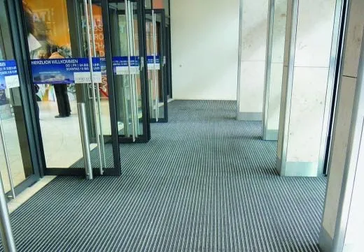 Die Matten bestehen aus Rauhaar-Ripseinlagen, die in einem Abstand von 5 mm in robusten Aluprofilen liegen. Nach dem Prinzip der offenen Reinigung setzen sich die abgeriebenen Schmutzpartikel nicht in der Einlage fest, sondern fallen während des Gehens in die Zwischenräume der Mattenstäbe. Der Hersteller versichert, dass der Schmutzeintrag ins Innere des Gebäudes so um 90 Prozent reduziert werden kann.