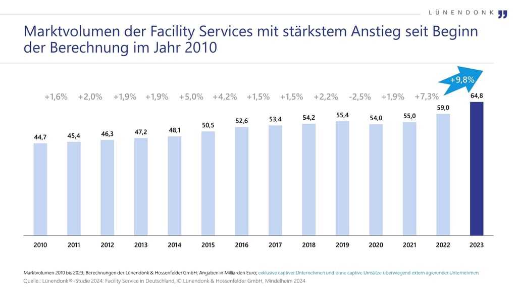 Das Marktvolumen für Facility Services in Deutschland wuchs in 2023 um 9,8 Prozent auf 64,8 Milliarden Euro. Das zeigt die neue Lünendonk-Studie "Facility Service in Deutschland", die auf der Analyse von 67 führenden und mittelständischen Unternehmen basiert.
