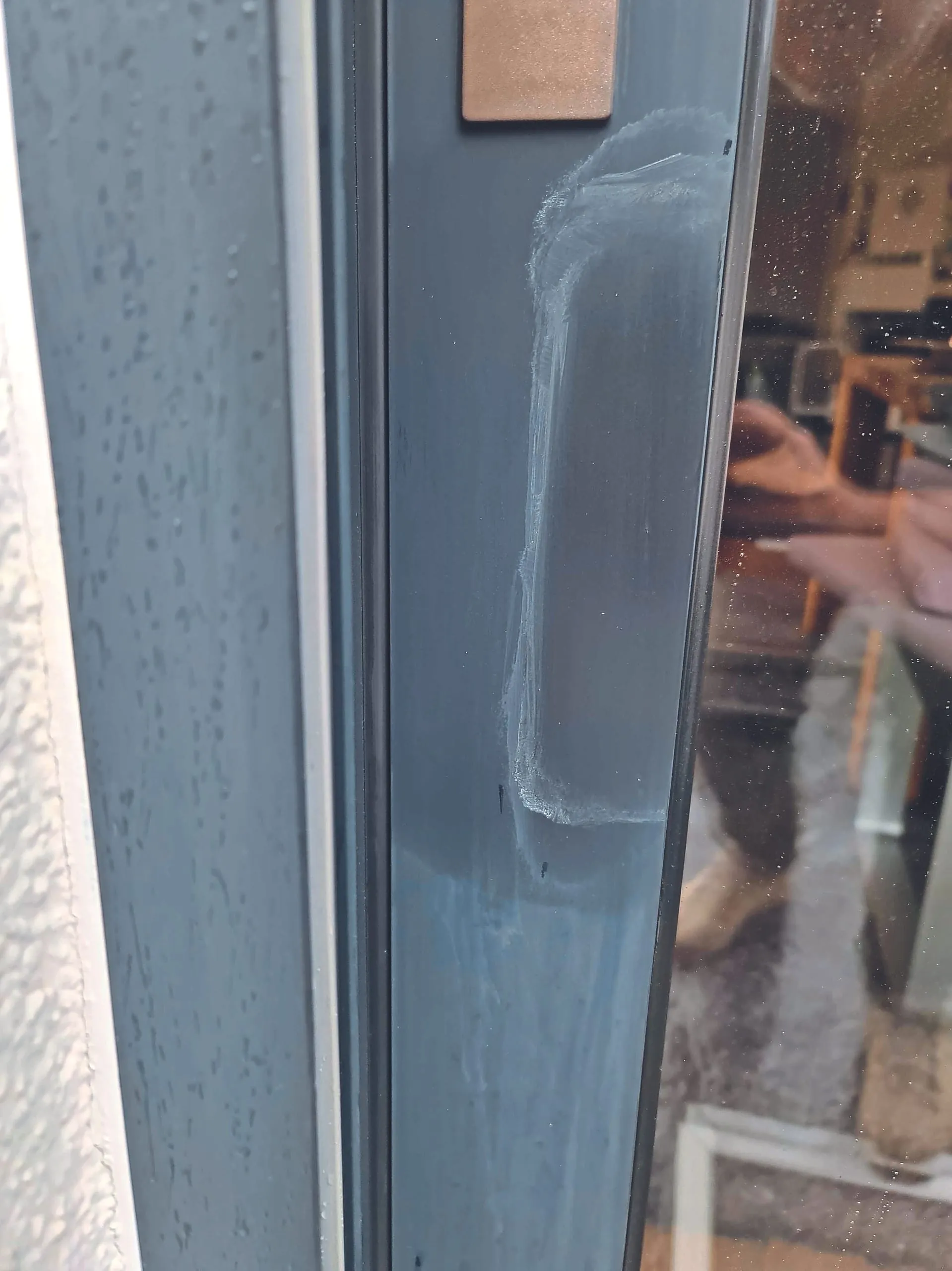 Im vorliegenden Schadensfall wurde ein ­alkalisches Reinigungsprodukt eingesetzt. Man hielt es für ausreichend, die farbigen Rahmenkomponenten dadurch zu schützen, indem man die davor liegenden Rollläden herunterlässt. Hierbei wurde jedoch nicht berücksichtigt, dass gerade im Bereich der Rolladenführung keine vollständige Abdichtung gegen eindringende Feuchtigkeit und somit gegen eine Benetzung der Rahmen­oberflächen möglich ist. Dies hatte zur Folge, dass die Reinigungsflotte auf die Farbkomponenten der Fensterrahmen einwirken konnte – mit dem zusätzlichen Nachteil, dass eine Glas- und Rahmenreinigung erst in den darauffolgenden Tagen stattfinden sollte, wodurch sich die Einwirkzeit der Reinigungsflotte auf die Farbkomponenten der Rahmen entsprechend erhöhte.