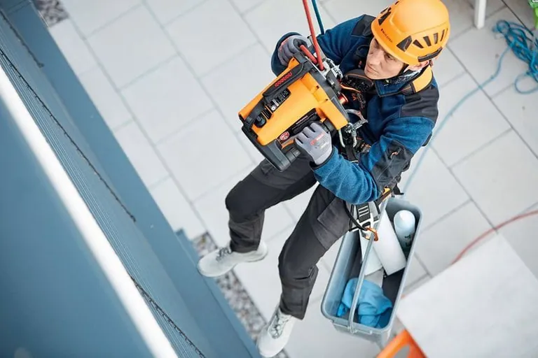 Fassadenreinigung mit akkubetriebener Seilwinde