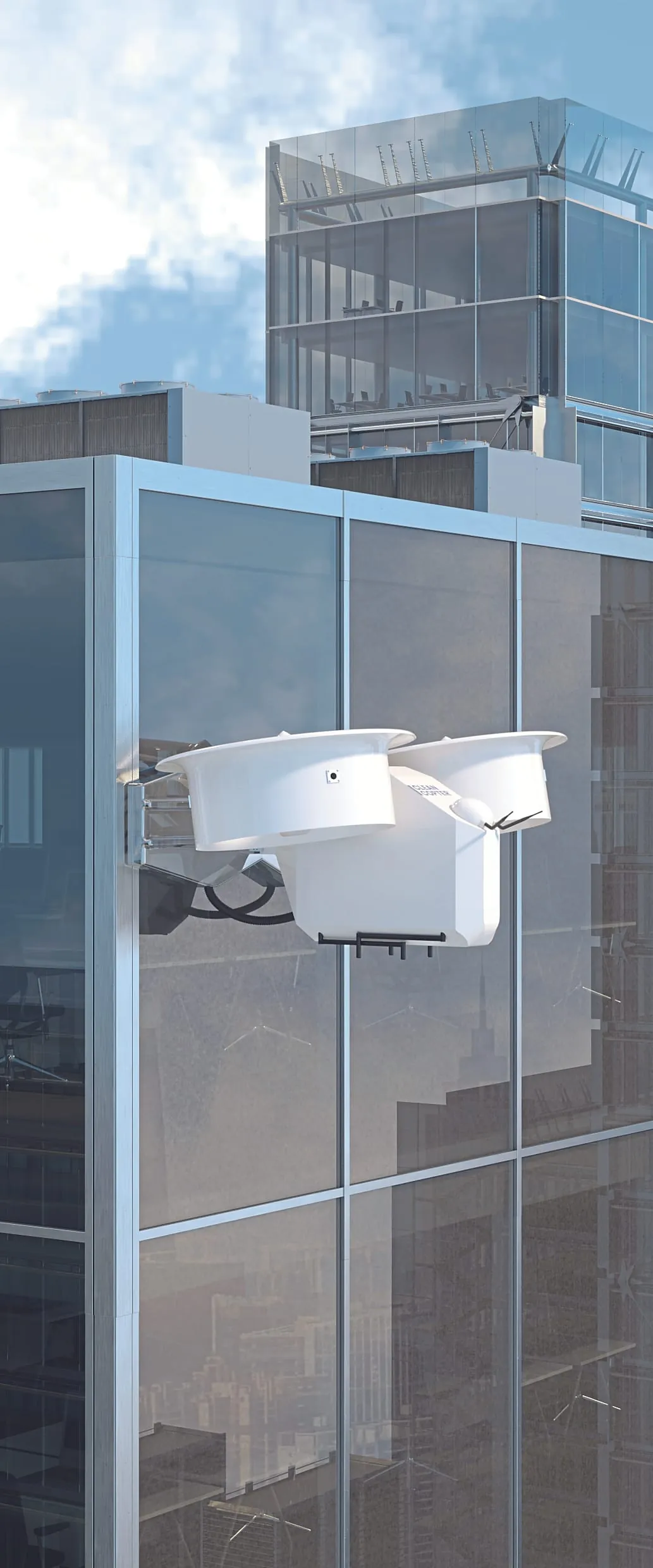 Der sogenannte Cleancopter, ein speziell für sein Anwendungsgebiet entwickelter Coaxial-Duokopter mit jeweils zwei gegenläufigen Rotoren, misst 2 × 1,2 m, hat ein Leergewicht von rund 60 kg (ohne Akku) und besitzt einen Wassertank mit circa 30 l Fassungsvermögen. Dies ermöglicht ihm eine Reinigungsphase von etwa 30 Minuten. Während eines Fluges lasse sich auf diese Weise eine bis zu 60 m² große Fläche bei mittlerem Verschmutzungsgrad reinigen.
