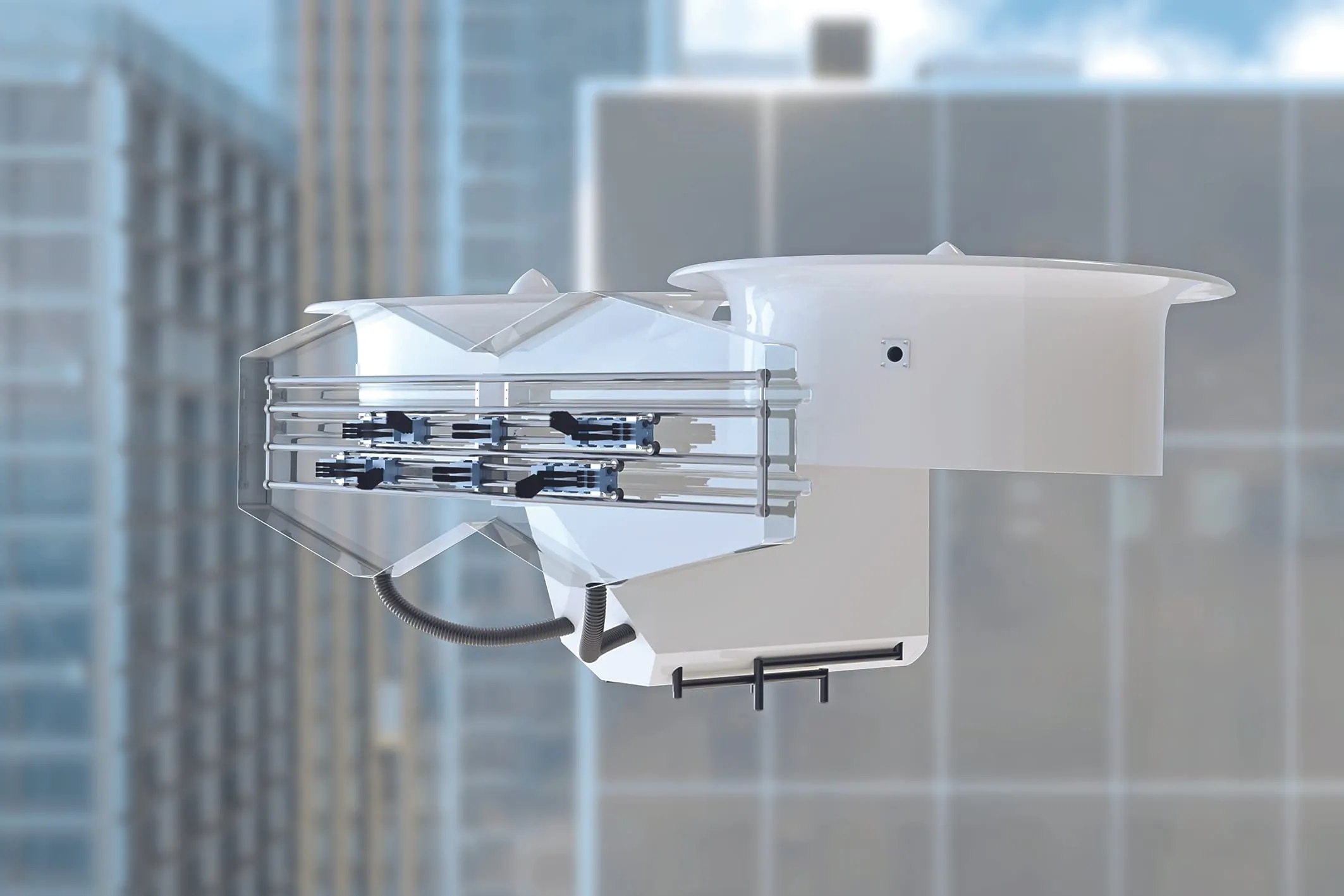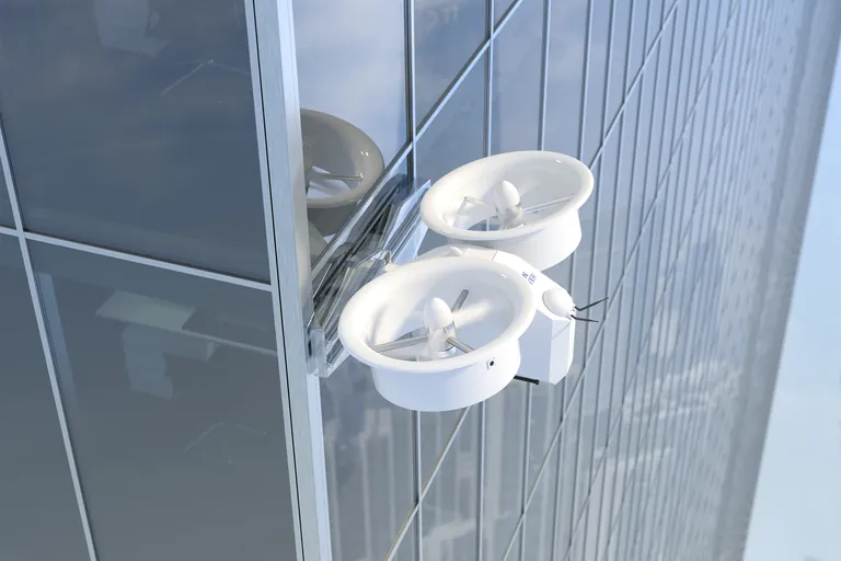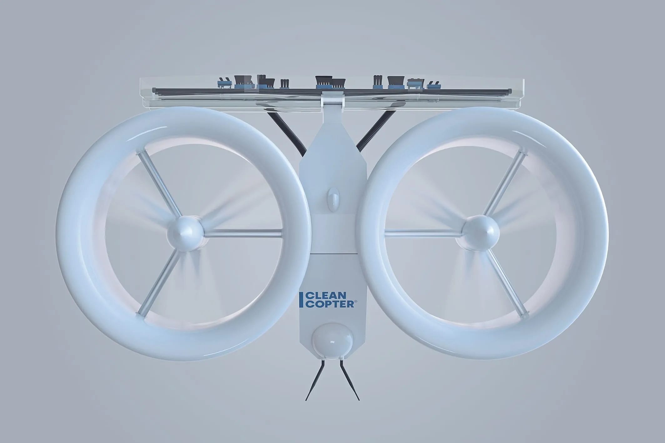 Nicht zuletzt wurde ein spezielles Luftleitblech entwickelt und aerodynamisch so ausgelegt, dass die Rotoren genügend Luftzuführung für den nötigen Auftrieb und zur Kühlung des Antriebs erhalten, obwohl sich die Drohne während des eigentlichen Reinigungsvorgangs nur relativ langsam bewegt. Die Rotorgeometrie ist ebenfalls eine Spezialentwicklung, da keine marktüblichen Rotoren mit den erforderlichen technischen Parametern erhältlich sind.