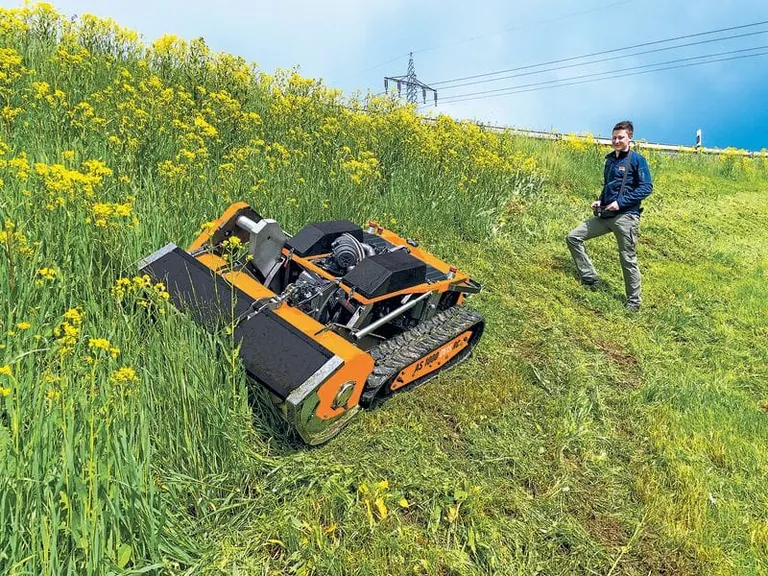 Dank des flexibel einstellbaren Mähdecks kann der neue Schlegelmäher an alle Geländebedingungen angepasst werden. Der ferngesteuerte Hangmäher mit seiner kompakten Bauweise mäht – dank Fernsteuerung aus sicherer Entfernung – auch schwieriges Gelände und schwer zugängliche Flächen. Groß dimensionierte Raupenlaufwerke mit Stahleinlagen sorgen für geringen Bodendruck, ideale Kraftübertragung und Halt an steilen Hängen.
