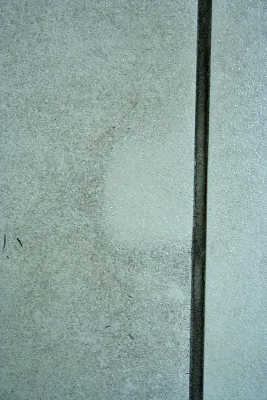 Ursprünglich war in diesem Friseursalon eine weiße Epoxidharzfuge in Auftrag gegeben worden. Ohne Rücksprache und ohne jegliche Information an den Auftraggeber wurde vom Bodenleger statt der weißen eine schwarze Fugenmasse eingebracht. Natürlich wurde dies beanstandet, die schwarze Epoxidfugenmasse musste wieder herausgefräst und anschließend durch eine neue, diesmal weiße Epoxidharzfuge ersetzt werden. Bei der Objektbegehung war für den Gutachter schnell erkennbar, dass sich auf den Bodenfliesen tatsächlich erhebliche Verschmutzungen befinden. Die Ursache dieser Verschmutzungen und sichtbaren Vergrauung sind Restanhaftungen der Epoxidharzverfugung auf den Feinsteinzeugfliesen. Nach oberflächlicher Schmutzbeseitigung auf den Fliesen durch den Gutachter wird erkennbar, dass sich auf den Bodenfliesen Rückstände in Form eines Harzschleiers befinden. An diesen Rückständen der ursprünglichen Verfugung setzen sich Schmutzpartikel fest. Bei der Unterhaltsreinigung wird der Schmutz nicht aufgenommen, vielmehr verstärkt sich die Schmutzanhaftung im Laufe der Zeit immer mehr.