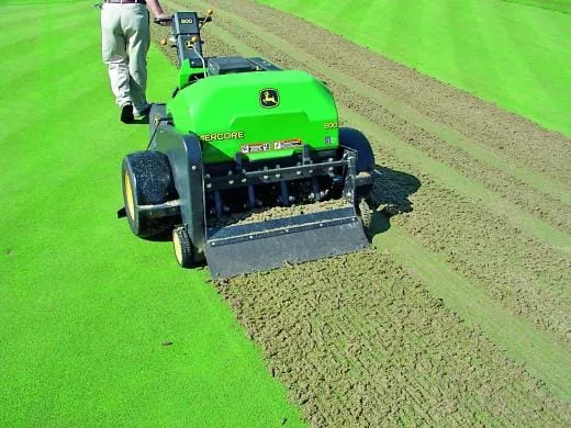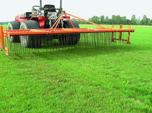Zum Standardprogramm gehört auch das Aerifizieren. Dabei werden ca. 400 Löcher je Quadratmeter in etwa 10 cm Tiefe in den Boden gebracht. Auch hierbei kommen Schlepperanbaugeräte zum Einsatz. Ziel ist, die besonders verdichteten oberen Schichten so aufzubereiten, dass sie wieder ausreichend Luft und Wasser für die Graspflanzen aufnehmen können. Nach diesen Arbeitsgängen ist eine Absandung der gesamten Fläche von Vorteil. Dabei wird gewaschener Sand (3 bis 5 l/m2) gleichmäßig aufgebracht und mit einem (Anbau-)Schleppnetz eingearbeitet. Dies fördert die Tiefenverwurzelung und damit die Belastbarkeit des Rasens. Nach Niederschlägen trocknet das Spielfeld schneller wieder ab. Die gleichmäßige Sandverteilung garantiert ein Kreiselstreuer, den es speziell dafür als Schlepperanbaugerät gibt. Tiefere Bodenverdichtungen mindern die Wasserführung erheblich. Verbesserungen bringt der Einsatz von Schlitzfräsen. Dabei werden im Abstand von ca. 12 bis 15 cm Schlitze mit ca. 2 cm Breite 15 cm tief in den Boden gebracht. Das dabei ausgeworfene Material ist mit dem Schleppnetz zu verteilen. So werden gleichzeitig geringe Bodenunebenheiten beseitigt. Eine solche Maßnahme ist auf alle Fälle in Kombination mit den vorhergehend beschriebenen Arbeiten sinnvoll.