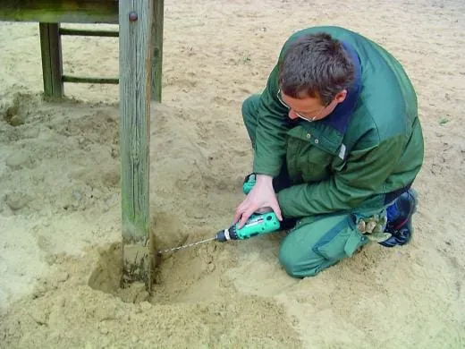 Jahreshauptprüfung der Spielplätze: Das Freilegen von Standpfosten aus Holz ist dabei ein „Muss“! Geprüft wird durch vorsichtiges Anbohren, ob sich das Holz – und wenn ja, wie tief – zersetzt hat.