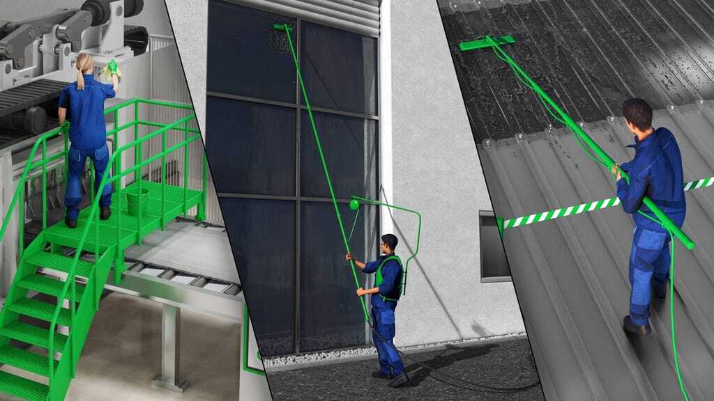 Um Durchstürze auf Dächern zu verhindern, müssen Beschäftigte bei Reinigungsarbeiten von Lichtbändern zum Beispiel eine sichere Standposition haben. Sind Teile nicht durchtrittssicher, muss ein Mindestabstand von zwei Metern, der abgesperrt und gekennzeichnet werden muss, eingehalten werden. Maschinen müssen vor Reinigungsarbeiten immer ausgeschaltet und gegen Wiedereinschalten gesichert werden. Teleskopstangensysteme sollten – soweit möglich – stets als Leiteralternative verwendet werden und Leitern nur dann zum Einsatz kommen, wenn es keine sichere Alternative gibt.