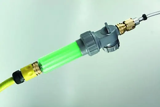 Der neue HiFlo-Seifendosierer von Unger wurde für die Verwendung mit dem CarbonTec System und der flüssigen Seife Unger-Liquid konstruiert. In Verbindung mit Reinstwasser unterstützt er die Reinigung stark verschmutzter Oberflächen, die noch nie oder über einen längeren Zeitraum nicht mit reinem Wasser gereinigt wurden. Der Aufsatz wird zwischen der Stange und dem Wasserfilter installiert. Im laufenden Betrieb wird die Flüssigseife im durchsichtigen Behälter dem Wasser in der Stange beigemischt. Die Seifenkonzentration hängt dabei vom Wasserdurchfluss ab (dem Druck auf der Wasserleitung) und der eingefüllten Seifenmenge. Auf dem Kontrollrad am Seifendosierer wählt man dementsprechend zwischen den gut lesbaren Reglerpositionen Seife, Wasser oder aus. Die letztere stoppt den Durchfluss ganz.