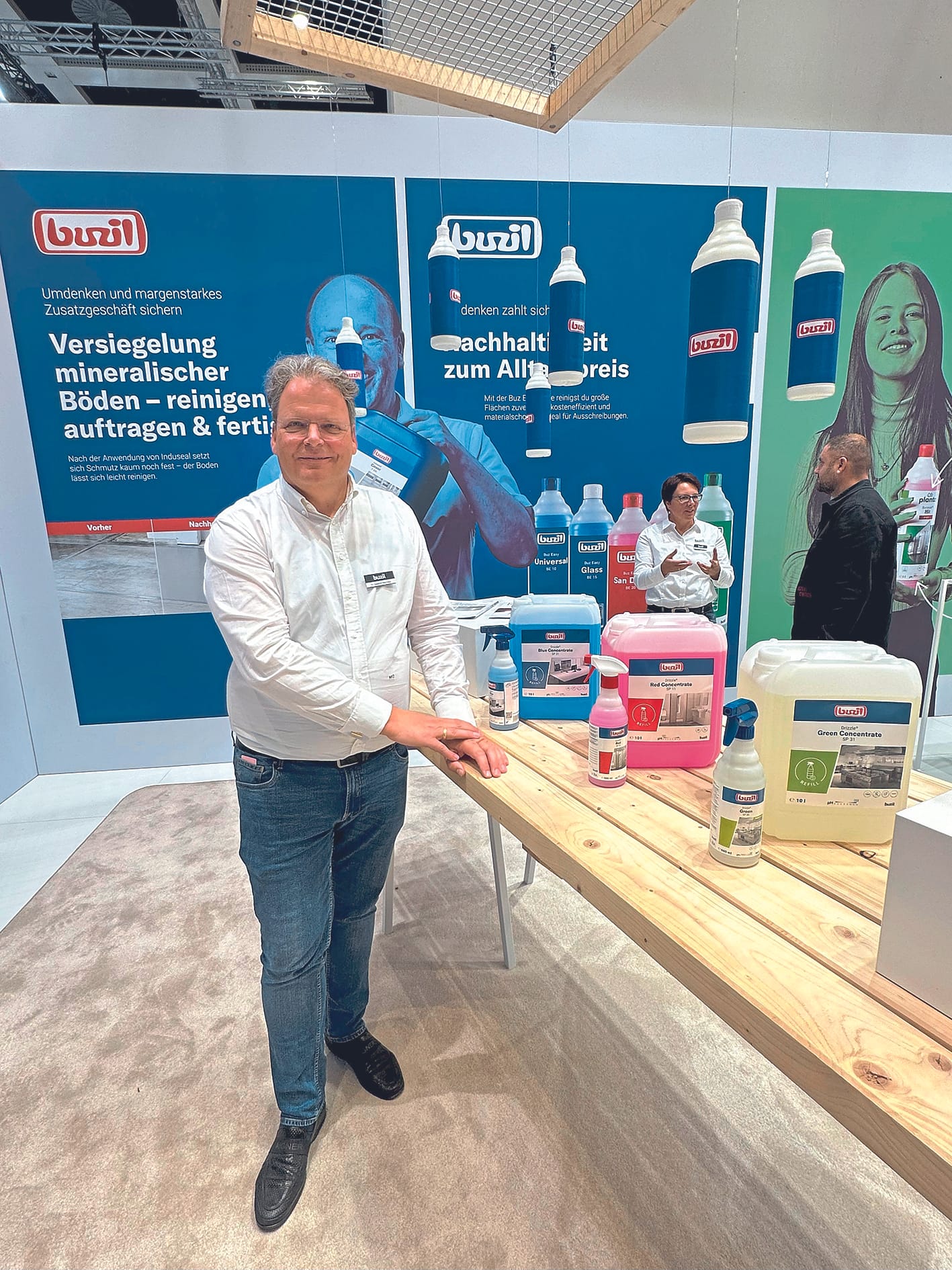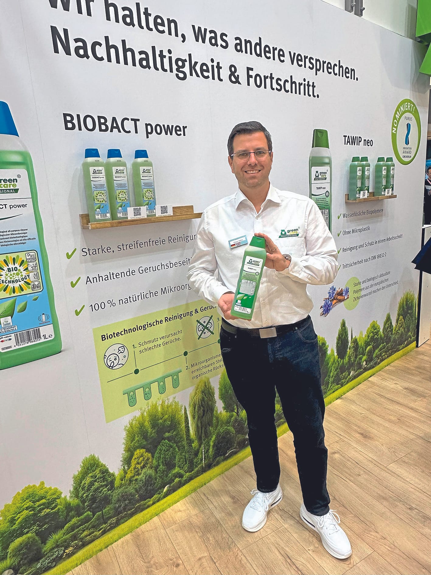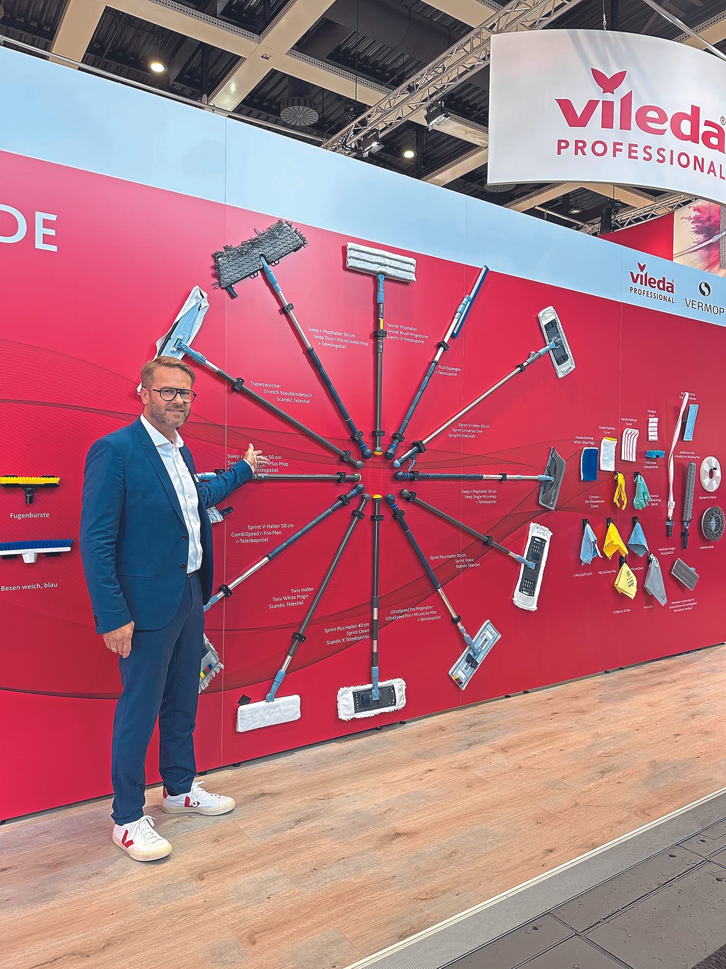 Vileda Professional/Vermop: Der Messeauftritt stand im Zeichen der Markenharmonisierung von Vileda Professional und Vermop. Seit Mitte 2023 ist Vermop ein Geschäftsbereich von Freudenberg Home & Cleaning Solutions. Die gesamte Bandbreite des Vileda-­Professional-Angebots zeigte Managing Director Christian Nowak (Bild). Die Vermop-Reinigungssysteme werden sukzessive unter der Marke Vileda Professional vertrieben. Dabei handelt es sich um ein reines Rebranding. Die Umstellung wird einen längeren Zeitraum in Anspruch nehmen und begann im Juni 2025. Die Marke Vermop bleibt für Angebote im Maschinensektor erhalten. Das bedeutet, dass Vermop innerhalb des Portfolios zukünftig eine spezialisierte Rolle einnehmen wird, um Lösungen in diesem Segment anzubieten.