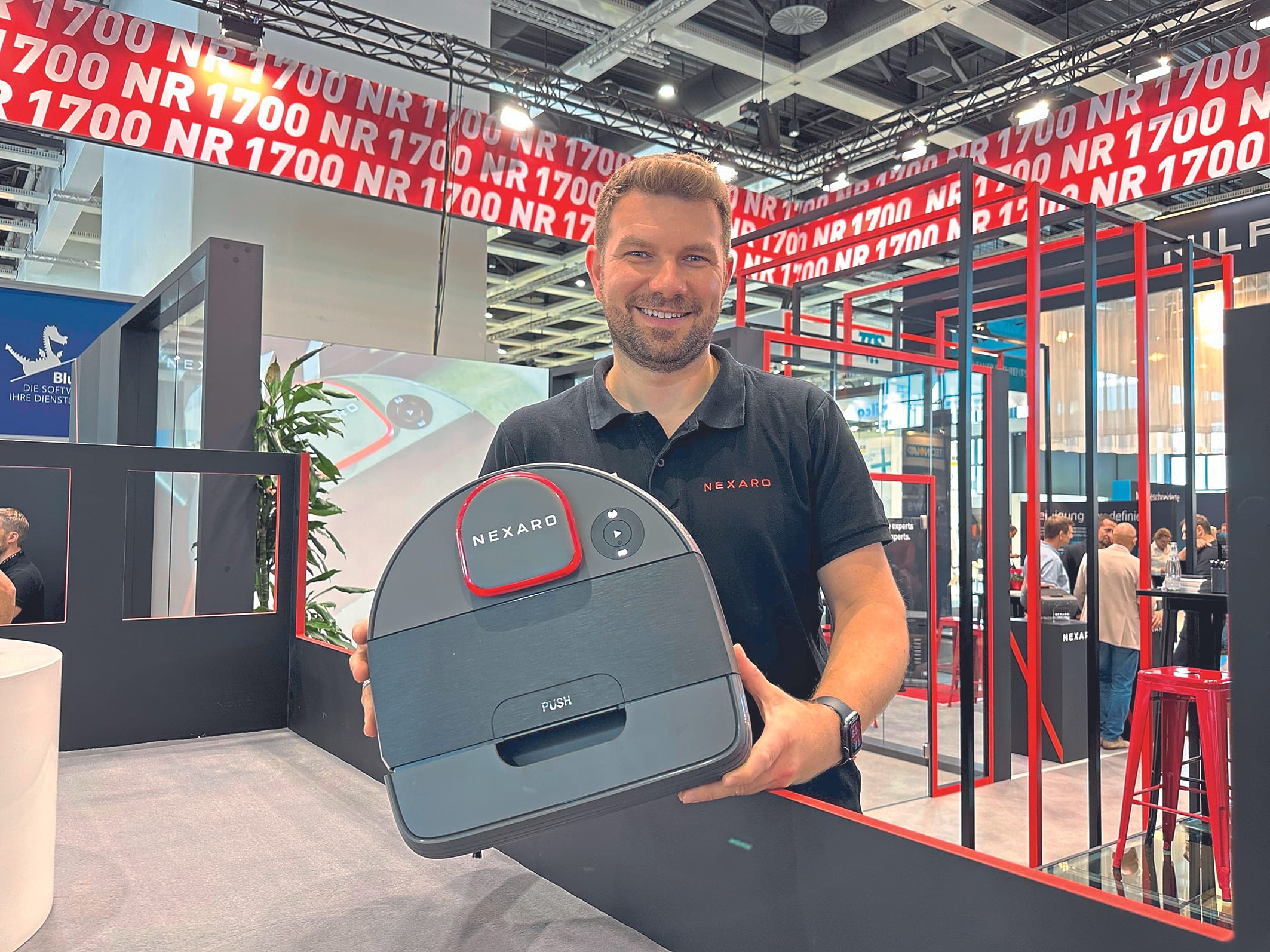 Nexaro: Messe-Premiere beim Wuppertaler Technologie-Start-up hatte der autonome Saugroboter Nexaro NR 1700, der das nun abgekündigte Vorgängermodell Nexaro 1500 ersetzt. Laut Marketingleiter André Hartmann (Bild) kombiniert der neue Nexaro 1700 leistungsstarke KI-Technologie mit kompaktem Design und wurde speziell für den Einsatz auf großen Flächen für bis zu 1.000 Quadratmeter konzipiert. Eine ebenfalls neue Ladestation erleichtert die exakte Platzierung des Geräts durch integrierte optische Hilfen. Ein robustes Gehäuse mit verstärkter Staubbehälterabdeckung sorgt weiterhin für mehr Stabilität, die nun integrierte Fase hinter dem Bumper ermöglicht ein dichtes Auffahren an Objekte. Nicht zuletzt bestätige die TÜV-Zertifizierung die Erfüllung höchster Sicherheitsstandards wie der internationalen Norm IEC 63327 für gewerbliche Reinigungsroboter und ein ­HEPA-Filter verbessere nebenbei die Luftqualität. Letzteres sei durch einen unabhängigen Labortest der SLG Prüf- und Zertifizierungs ­GmbH bestätigt worden: Mit einem Wert von 52,7 Prozent bei der Staub­aufnahme auf Teppich gemäß dem europaweit anerkannten Prüfstandard EN IEC 62885-7:2020 übertreffe der genannte Saug­roboter Vergleichsgeräte deutlich.