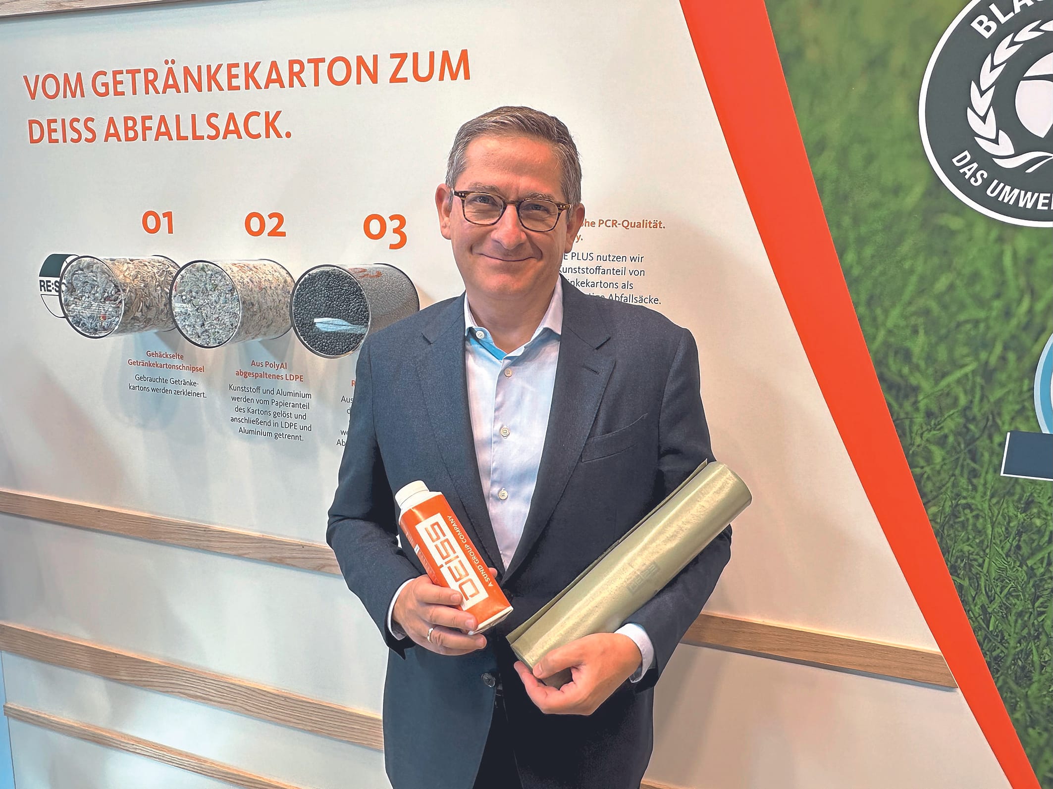 Deiss: Mit Re:Source Plus hat der zur Hamburger Sund-Gruppe gehörende Müllsackhersteller ein neues Produkt angekündigt, das neue Maßstäbe in Sachen Nachhaltigkeit, Funktionalität und Innovationskraft setzen soll. Das Besondere daran ist die Verwendung von bisher ungenutztem PolyAl-Material – einem Verbund aus Kunststoff und Aluminium, das aus recycelten Getränkekartons gewonnen wird. Bisher konnte nach Aussage von Deiss-Geschäftsführer Clemens Eichler (Bild) nur das Papier der Kartons wiederverwertet werden, jetzt ermögliche ein innovatives Trennverfahren erstmals, den Kunststoffanteil aus dem PolyAl-Verbund herauszulösen und zu Post-Consumer-Recyklat (PCR) aufzubereiten. Re:Source Plus biete mit einem Anteil von mindestens 80 Prozent dieses PCR eine ressourcenschonende, umweltfreundliche Alternative zu herkömmlichen Abfallsäcken. Dafür werden sie Clemens Eichler zufolge mit dem Umweltzeichen Blauer Engel zertifiziert.