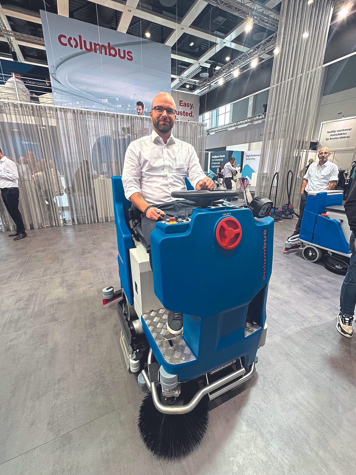 Neues gab es in Berlin auch beim 140-Liter-Aufsitzer mit 85 Zentimetern Arbeitsbreite zu sehen wie von Columbus-Vertriebsleiter André Jezek (Bild) vorgeführt: Unter der Modellbezeichnung ARA 85|BM 140 W ist dieser Maschinentyp nun mit zwei Walzenbürsten und Seitenbesen zusätzlich zur bisherigen Scheibenbürsten-Version erhältlich.
