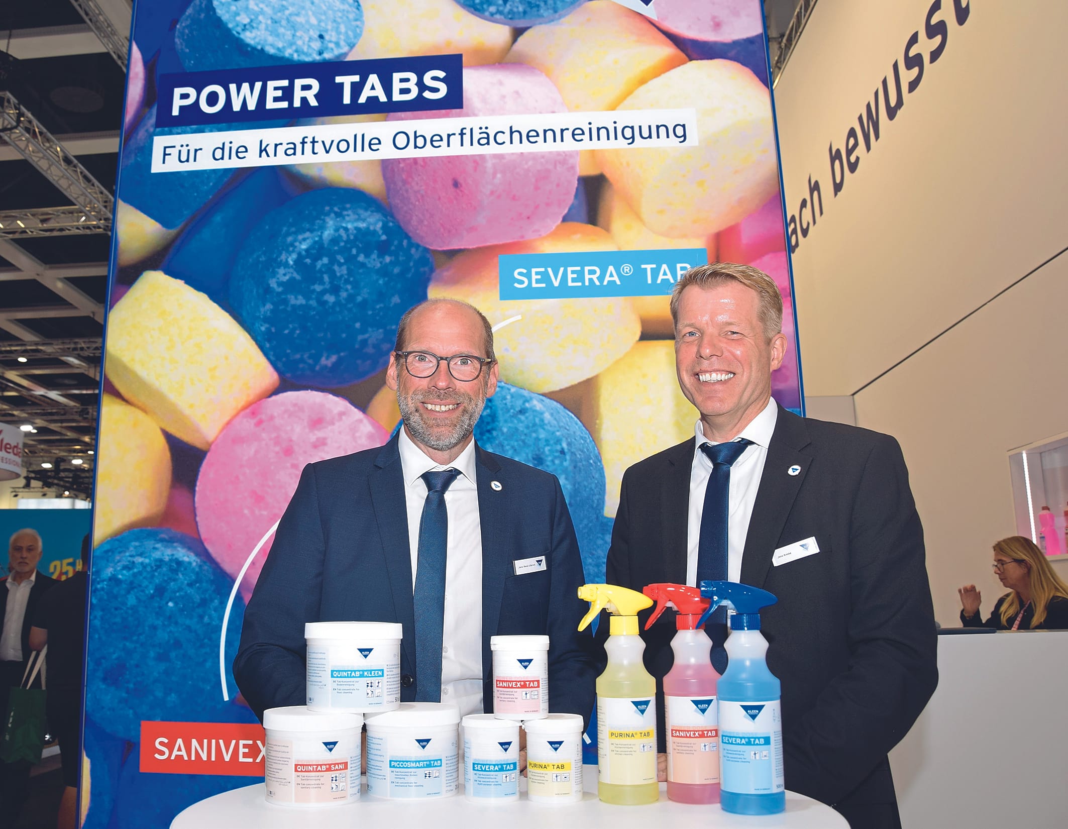 Zum Sortiment gehören ein Allzweckreiniger (Severa Tab), ein Konzentrat für die Oberflächenreinigung im Sanitärbereich (Sanivex Tab) und ein Küchenreiniger (Purina Tab). Vor Ort werden die Tabs in Wasser aufgelöst und können nach wenigen Minuten Warte­zeit verwendet werden. Eine Dose mit 50 Tabs à je drei Gramm ergibt 50 Sprühflaschen mit 500 Millilitern Inhalt. Marketingleiter Jens Knoke (Bild re., zusammen mit Jens René Ulbrich, Vertriebsleiter Deutschland/Österreich) spricht von einer "sehr kleinen, platzsparenden Verpackung und sehr großen Menge an Anwendungslösung“.