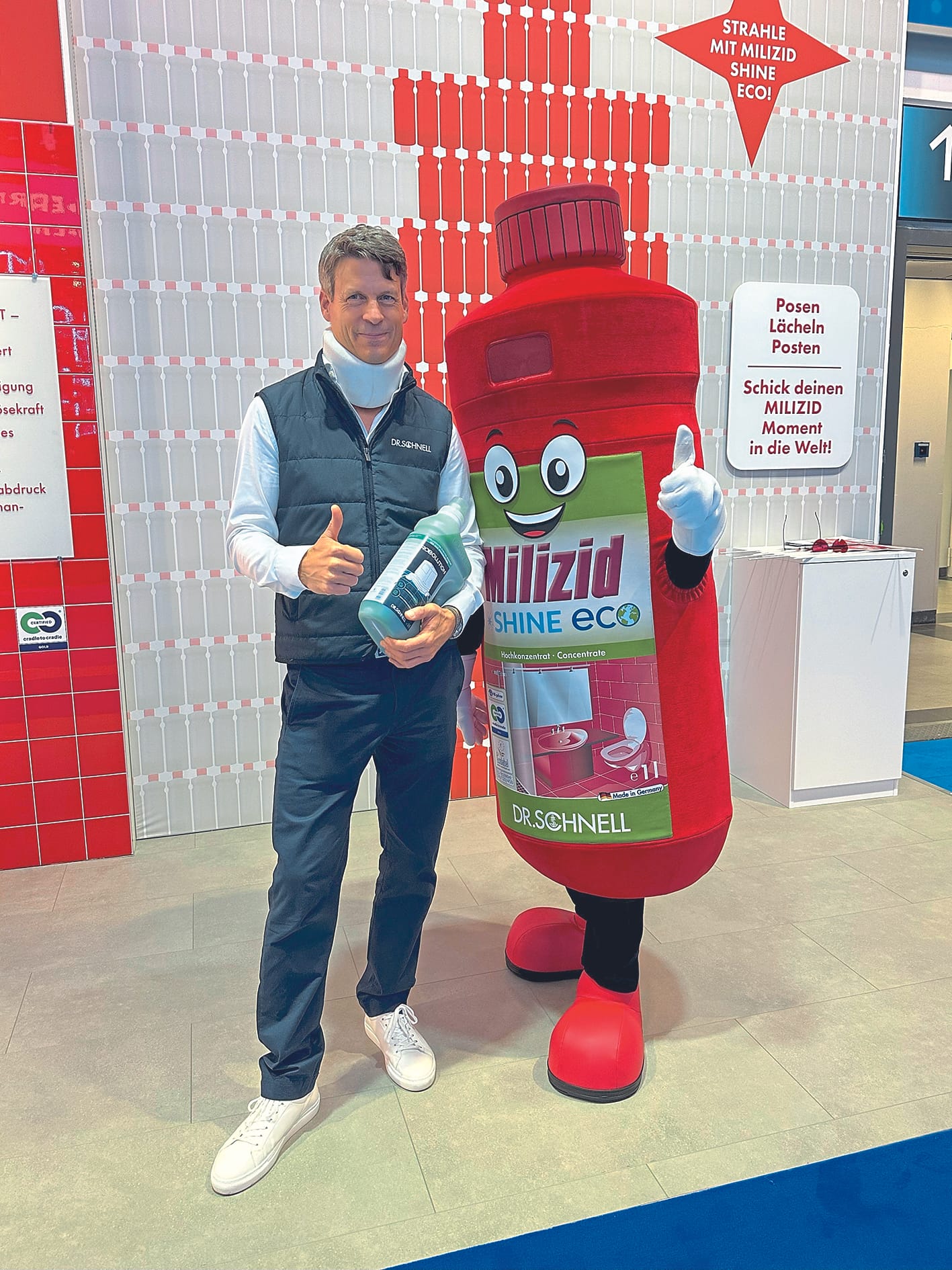 Dr. Schnell: Zum zweiten Mal in Folge gewannen die Münchener den renommierten Purus Innovation Award – in diesem Jahr mit dem Sanitärreiniger Milizid One. Daumen hoch dafür von Geschäftsführer Dr. Thomas Schnell (Bild) und dem Milizid-Maskottchen. Bei dem erstmals auf der Messe gezeigten Produkt handelt es sich um einen methansulfonsäure-basierten Sanitärreiniger aus ausschließlich regenerativen Rohstoffquellen. Für dessen Formulierung kommen ­Biopolymere aus Kollagen und Parfümöle aus Quellen der europäischen Landwirtschaft zum Einsatz. Die enthaltenen Tenside sind nicht­ionische Tenside auf Basis von Ölen aus Soldatenfliegenlarven. Alle Inhaltsstoffe für dieses Produkt seien seit mehreren Jahren in Zusammenarbeit mit BASF, Sasol und weiteren Rohstoffproduzenten definiert und entwickelt worden mit dem Ziel, einen zu 100 Prozent regenerativen Sanitärreiniger mit vollständig europäischer Lieferkette zu konzipieren.