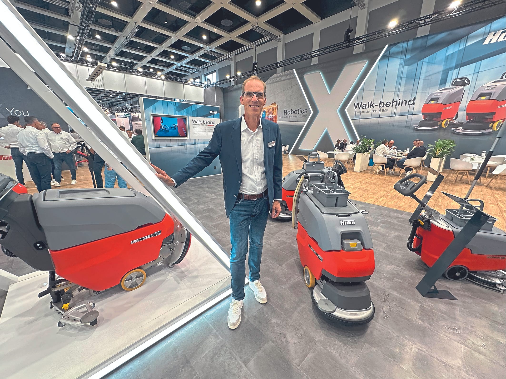 Hako: Im Mittelpunkt des Messeauftrittes stand die neue Walk-­behind-Generation, mit der der Reinigungsmaschinenhersteller aus Bad Oldesloe Mitte 2026 auf den Markt gehen wird. Mit optimierter Bedienung und Ergonomie, technischen Features für mehr Sicherheit und Effizienz sowie reduziertem Ressourcenverbrauch sollen die kommenden Modelle Scrubmaster B35 und B50 für eine noch komfortablere und wirtschaftlichere Reinigung mittelgroßer Flächen sorgen, wie Frank Ulbricht (Bild), Geschäftsführer Vertrieb & Marketing, erläuterte.