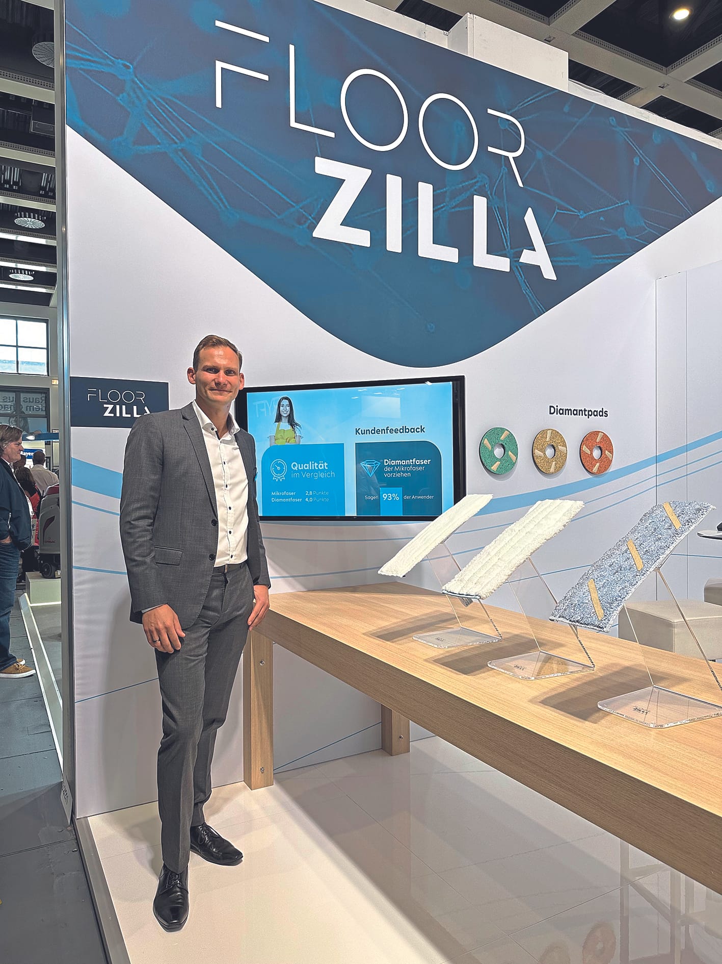 FloorZilla: Mit Simply Swing präsentierte Enrico Flade den Einstieg in die Diamantfaser-Technologie von FloorZilla. Als Neuheit in der Swing-Produktlinie verbindet der Diamant-Wischbezug starke Basisreinigung mit sehr guter Ergonomie bei der täglichen Reinigung von Hart- und elastischen Böden. Der Wischbezug ist auf das Wesentliche reduziert und passt in schmale Boxsys­teme. Darüber hinaus gibt es den Daily Swing für die Unterhaltsreinigung und den Power Swing für die Intensivreinigung. Wischbezüge, ausgestattet mit mikroskopisch kleinen Diamanten, reinigen tiefenwirksam und entfernen auch hartnäckige Verschmutzungen wie Grauschleier und Verstrichungen. Gegenüber konventioneller Mikrofaser bietet die Diamantfaser eine längere Lebensdauer und ­überlegene Ergebnisse. Laut FloorZilla reduziert sie den Kraftaufwand um bis zu 60 Prozent und sorgt so für ein ermüdungsfreies, ergonomisches Arbeiten.