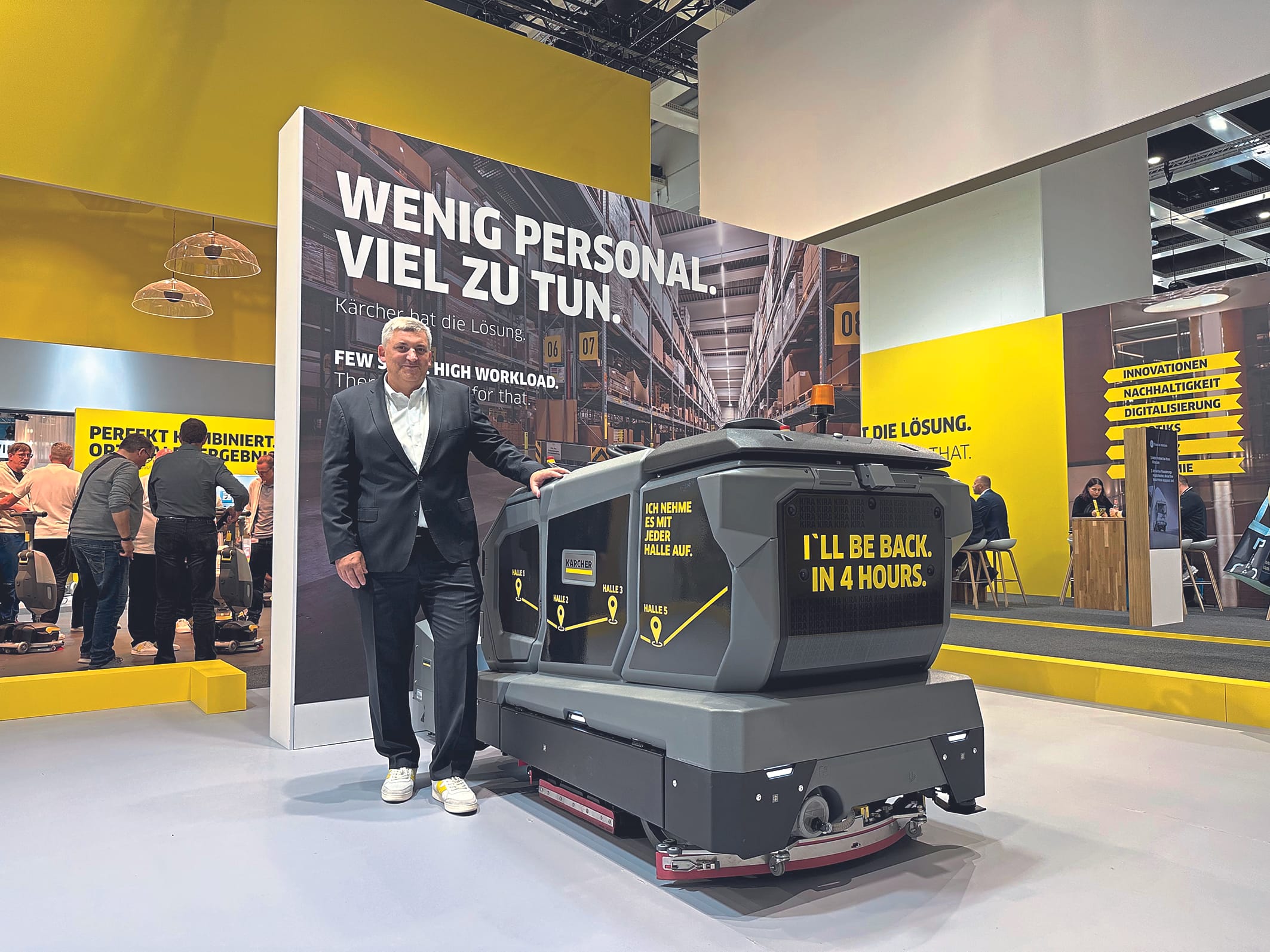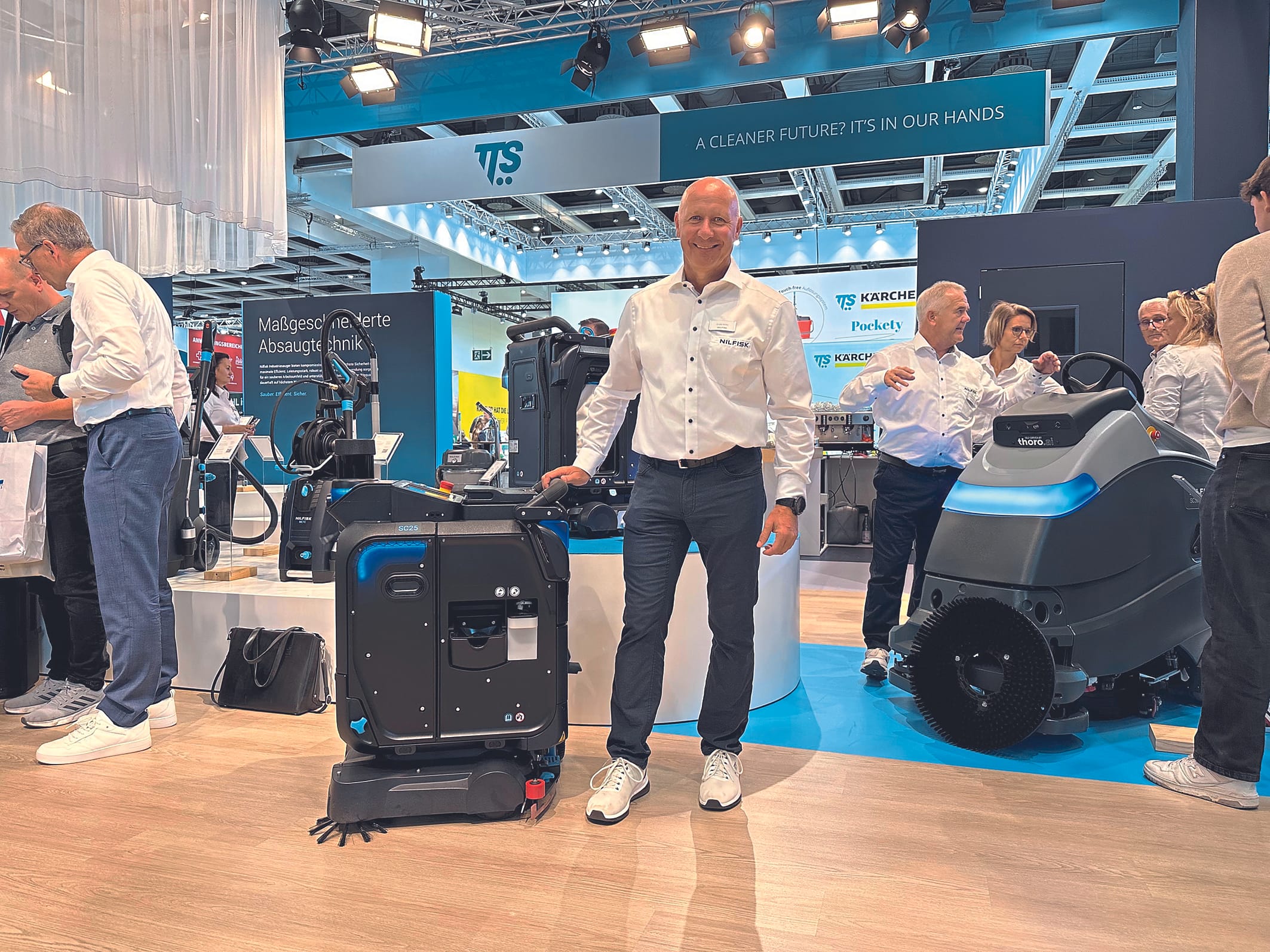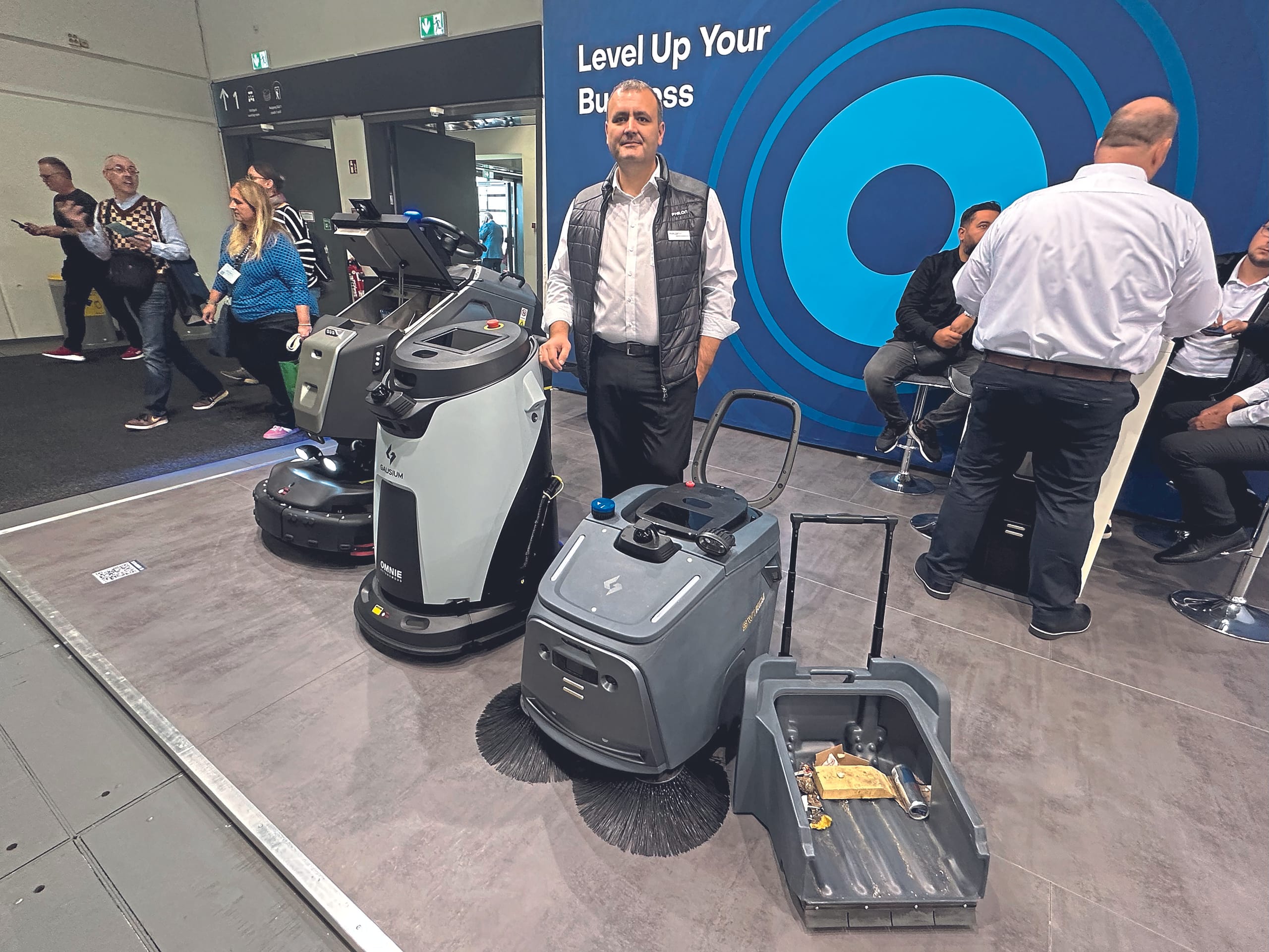 Nilfisk: Zu den Highlights am Stand zählte die neue ­autonome Scheuersaugmaschine SC25 (VP25 als Trockensauger) für die Reinigung kleinerer Flächen, hier gezeigt von Guido Wilfer. Auch verwinkelte Raumkonzepte und Kanten werden mittels Null-Grad-Drehung und reduzierter Geschwindigkeit gesäubert. Intelligente Sensoren, ein 360-Grad-Lidar-Laserscanner und fortschrittliche Kameratechnik sorgen dabei für Prozesssicherheit und -effizienz, auch in Bereichen mit Publikumsverkehr. Die SC25 kann bis zu drei Stunden unterbrechungsfrei mit einer Arbeitsbreite von 36,6 Zentimetern bis zu 1.317 Quadratmeter in der Stunde reinigen. Verschiedene Reinigungsmodi sowie programmierbare Arbeitspläne bieten dabei Vielseitigkeit. Nach getaner Arbeit kehrt die SC25 in ihre Docking-Station zurück, um sich selbsständig aufzuladen, schmutziges Wasser zu entleeren und sauberes Wasser nachzufüllen.