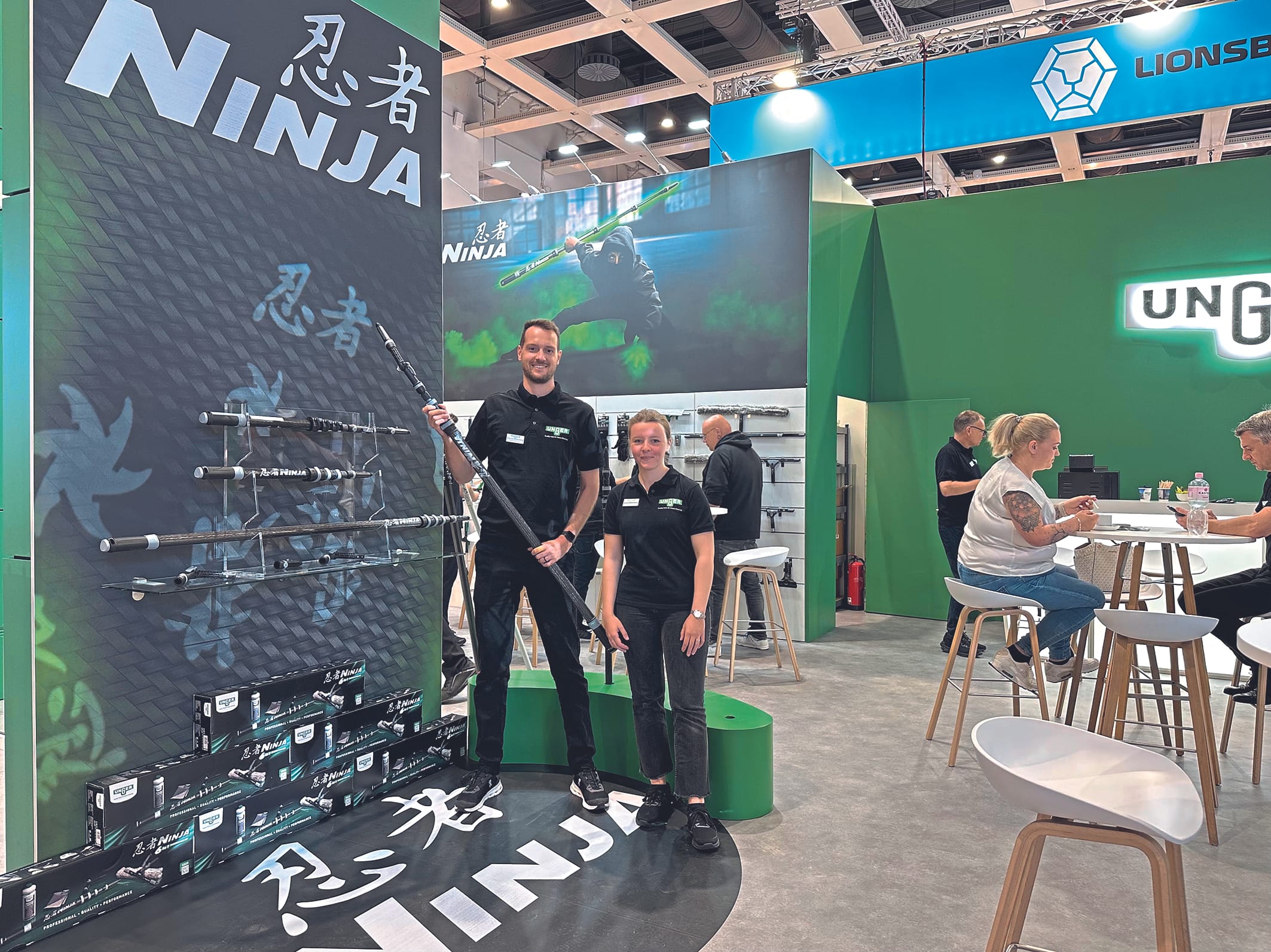 Unger: Malina Claßen und Stefan Koßmann (Bild) demonstrierten die Carbon-Teleskopstange Ninja. Sie zeichnet sich durch eine ergonomische Dreiecksform, ein geringes Gewicht sowie Stabilität und Steifigkeit aus. Das niedrige Gewicht reduziert den benötigten Kraftaufwand und macht die Glasreinigung komfortabler. Die Stabilität gewährleistet eine optimale Druckübertragung auf die Oberfläche. Und die Dreiecksform verhindert lästiges Verdrehen oder Verbiegen. Zudem sorgt der 2-K-Griff auch in nasser Umgebung für sicheren Halt. Beim Abstellen verhindert eine Anti-Rutsch-Endkappe, dass die Stange umfällt. Für einen sicheren Werkzeugwechsel ist sie mit einem Sicherheitskonus ausgestattet. Damit sind alle Unger-Werkzeuge kompatibel. An der gummierten Spitze halten Mikrofasertücher optimal, was das Trocknen von Fensterrändern oder das punktuelle Nachpolieren erleichtert. Nutzer ändern die Länge der Teleskopstange bis zu einer Reichweite von 5,5 Metern stufenlos über Klammern, die sich mit einer Hand öffnen und schließen lassen. Ein Auszugstopp verhindert ein zu weites Ausziehen der einzelnen ­Stangenelemente. Im eingefahrenen Zustand ist die Stange kompakt und leicht transportierbar. Mit dem zusätzlich erhältlichen Winkeladapter können Nutzer die Stange an jede Arbeitssituation anpassen. Er ist mit einem Schnellverschluss ausgestattet, mit dem unterschiedliche Arbeitswinkel frei eingestellt werden können.