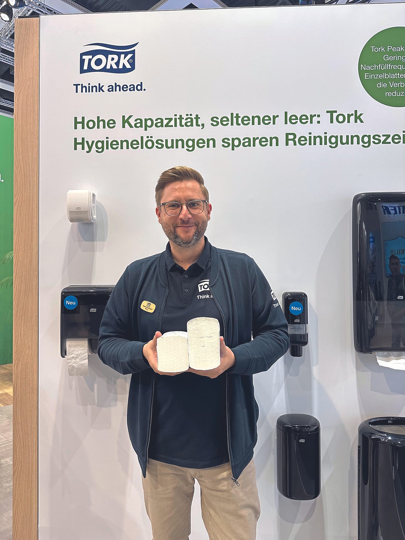 Tork: Die komprimierten Handtuchnachfüllungen des Multifold-Handtuchsystems Tork Xpress sind um 50 Prozent komprimiert, sodass doppelt so viele Handtücher Platz im Spender finden wie Stefan Bruckmann (Bild) demonstriert. Unternehmen benötigen dadurch weniger Lagerraum, die Wartungszeit wird reduziert. Während des Produktionsprozesses wird durch eine besondere Komprimierungstechnologie die Luftmenge in den Handtuchpaketen verringert, wodurch diese verdichtet und das Verpackungsmaterial um bis zu 27 Prozent reduziert wird. Dadurch können fast doppelt so viele Bündel pro LKW transportiert werden, was zu einer Senkung der CO2-Emissionen beiträgt.