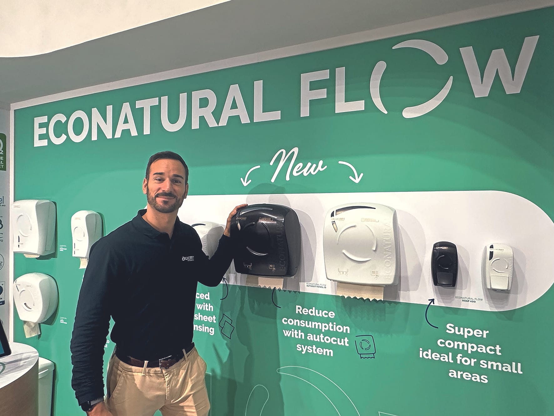 Lucart Professional: Der italienische Hersteller von Hygienepapier und Spendersystemen zeigte in Berlin unter anderem die EcoNatural-Flow-Produktreihe. Diese umfasst Spender für Toilettenpapier, gefaltete und gerollte Handtücher und auch für Seife. Die Produkte sind mit den Zertifizierungen OK Recycled/TÜV Austria und ReMade in Italy ausgezeichnet, was ihre vollständige Wiederverwertbarkeit garantiere. Diego Gramegna (Bild), Brand & Communication Marketing Manager bei Lucart, betont die Kreislauffähigkeit der EcoNatural-Flow-Spender. EcoNatural steht für ein Kreislaufsystem, bei dem Zellulosefasern, Polyethylen und Aluminium aus gebrauchten Getränkekartons zurückgewonnen werden. Die Fasern werden zu Fiberpack-Tissuepapier verarbeitet, während aus Polyethylen und Aluminium sogenanntes Al.Pe entsteht, das zur Herstellung der Flow-Spenderlinie zum Einsatz kommt.