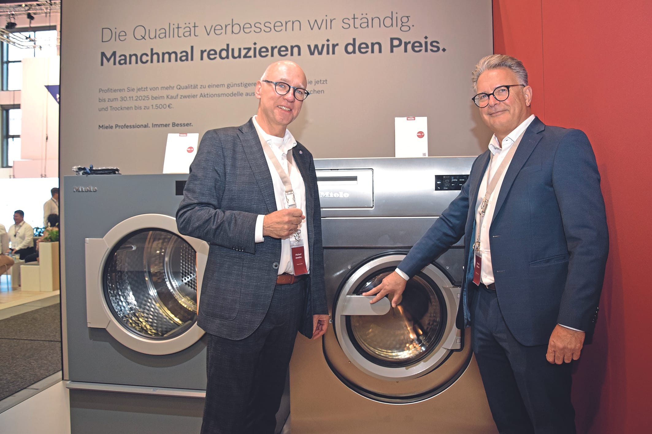 Miele: Michael Arendes (li.), Marketing Manager Deutschland, und Martin Hübner, Managing Director DACH, präsentierten die neuen Bench­mark-Waschmaschinen mit 27 (PWM 927) beziehungsweise 35 Kilogramm (PWM 935) Beladekapazität. Die größere Maschine kann bis zu 292 Mikrofaserwischbezüge oder 1.100 Reinigungstücher à 16 Gramm aufnehmen. In den Standardprogrammen für Reinigungstextilien werden nach Herstellerangaben bis zu 16 Prozent weniger Energie und bis zu 18 Prozent weniger Wasser verbraucht. Zur Verfügung stehen rund 90 Waschprogramme, darunter Varianten auch für das Vortränken von Reinigungstextilien. Im Rahmen eines patentierten Vorentwässerungsverfahrens werden grober Schmutz und verunreinigtes Wasser vor Beginn des Waschprozesses aus Wischbezügen oder Tüchern geschleudert. Eine Schontrommel mit Schmutzschlitzen sorgt dafür, dass grobe Partikel aus dem Trommelinneren schnell ins Abflusssystem befördert werden.