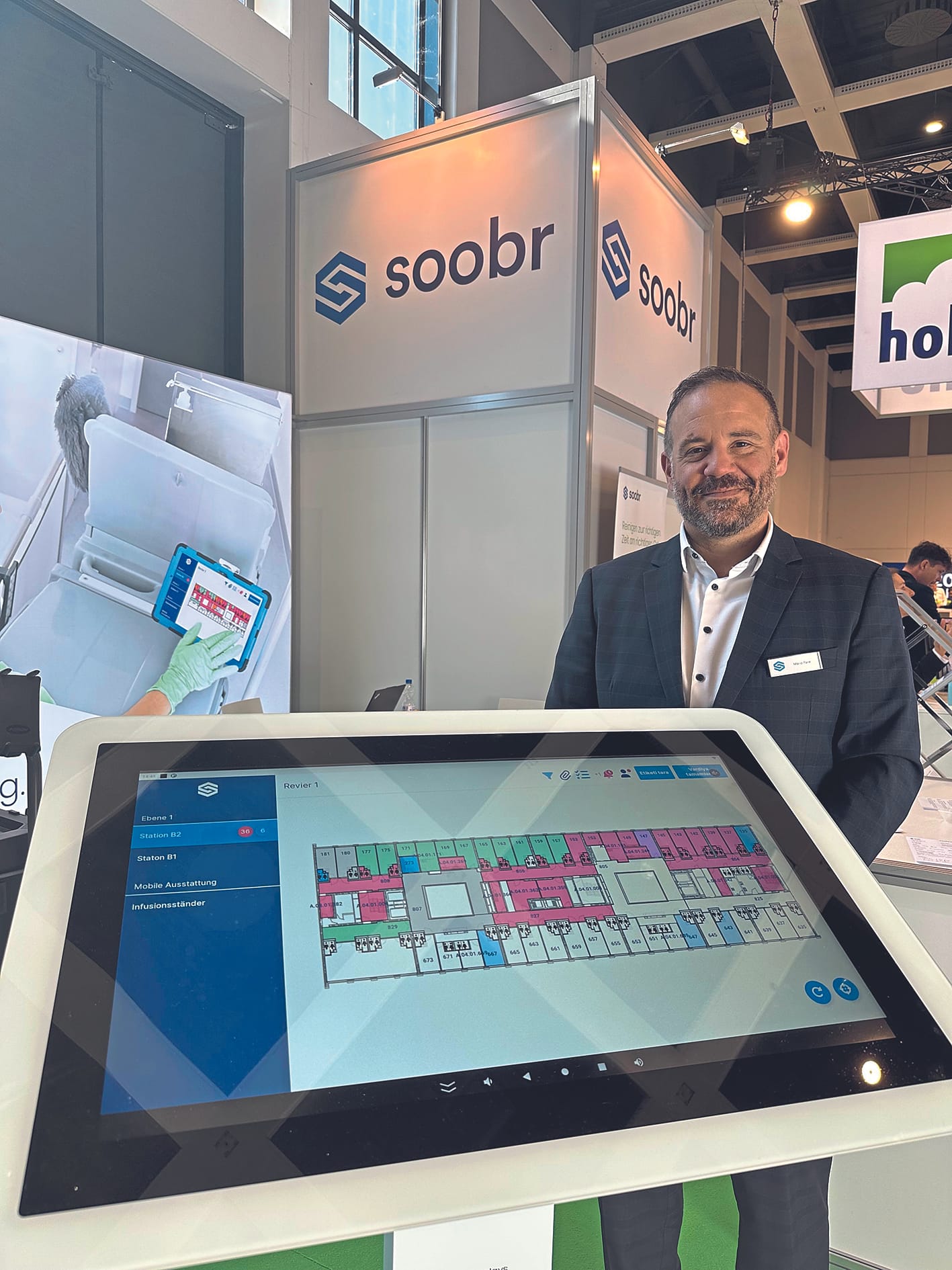 Soobr: Der Schwerpunkt des Schweizer Softwareanbieters, der auf der CMS 2023 den Purus Innovation Award gewann, lag auf dem Gesundheitswesen. Folglich führte man insbesondere mit Vertretern von Kliniken und Pflegeheimen viele Gespräche. Diesen konnte man zum Beispiel über eine Zeiteinsparung im Universitätsklinikum Mannheim von sieben bis zehn Prozent berichten, die sich durch den Einsatz der Software für dynamische Reinigungsplanung realisieren ließ. Die cloudbasierte Lösung vernetzt laut Mario Pane (Bild), Account Executive bei Soobr, Reinigungsroboter, KIS-, CAFM- und Sensorsysteme über offene Schnittstellen. Reinigungstätigkeiten, etwa bei Patientenaustritten, können so automatisiert angestoßen und dokumentiert, die Bettenaufbereitung vollständig digitalisiert werden. Reinigungsrelevante Daten werden zentral gebündelt und ermöglichen eine algorithmisch gesteuerte, dynamische Planung in Echtzeit. Dadurch entstehen transparente, effiziente Prozesse. Soobr entwickelt dabei in enger Zusammenarbeit mit Gesundheitseinrichtungen. Beispielsweise hat man mit dem Bundesverband für Hygiene und Krankenhausreinigung den Leitfaden zur Digitalisierung der Krankenhausreinigung mitentwickelt. Frank Müller, Vorstand Bundesverband für Hygiene und Krankenhausreinigung, hielt denn auch mit Andreas Mock von Soobr beim Praxisforum der CMS einen Vortrag mit dem Titel "Bits, Bots & Mythen – zwischen Science-Fiction und DIN 13063“.