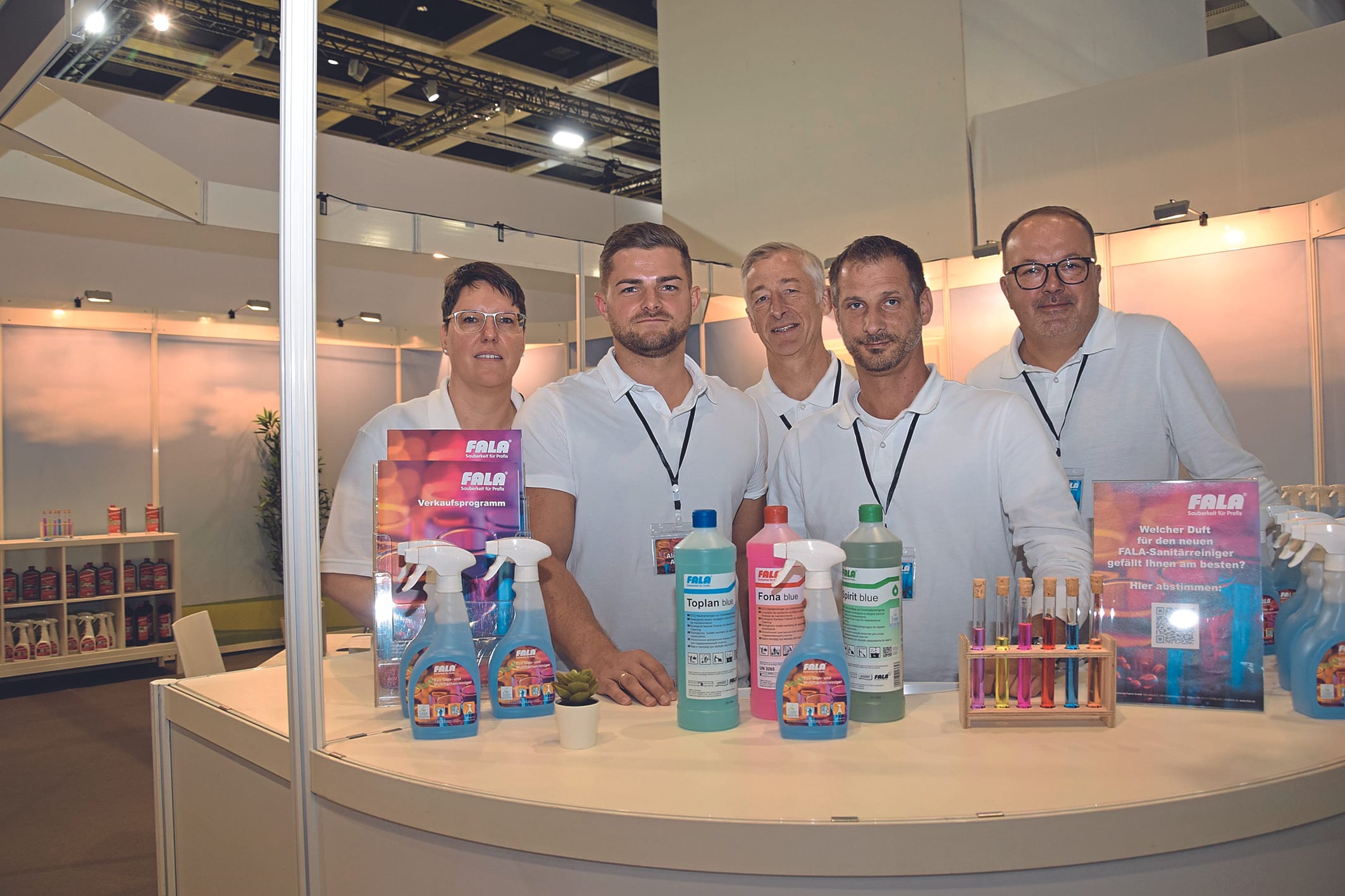 Fala: Geschäftsführer Andreas Grünig, Sebastian Ludewig (Vertrieb), Dr. Georg Schmauch (Produktentwicklung), Verkaufsleiter Alexander Ahrendt und Marina Lorek (Marketing; (v.re.) präsentierten mit dem EU-Ecolabel ausgezeichnete Produkte, darunter ein neuer Reiniger, der Verschmutzungen auf wasserfesten, alkalibeständigen Oberflächen sowohl im Innen- als auch im Außenbereich kraftvoll und mate­rialschonend beseitigt. Der Eco Glas- und Multiflächenreiniger hinterlässt keine Streifen oder Rückstände und trocknet schnell ab. Der Anteil von biobasierten, nachwachsenden Rohstoffen liegt bei 74 Prozent, die nachfüllbaren Flaschen mit mehrfach einsetzbarem Sprühkopf sind wiederverwendbar.