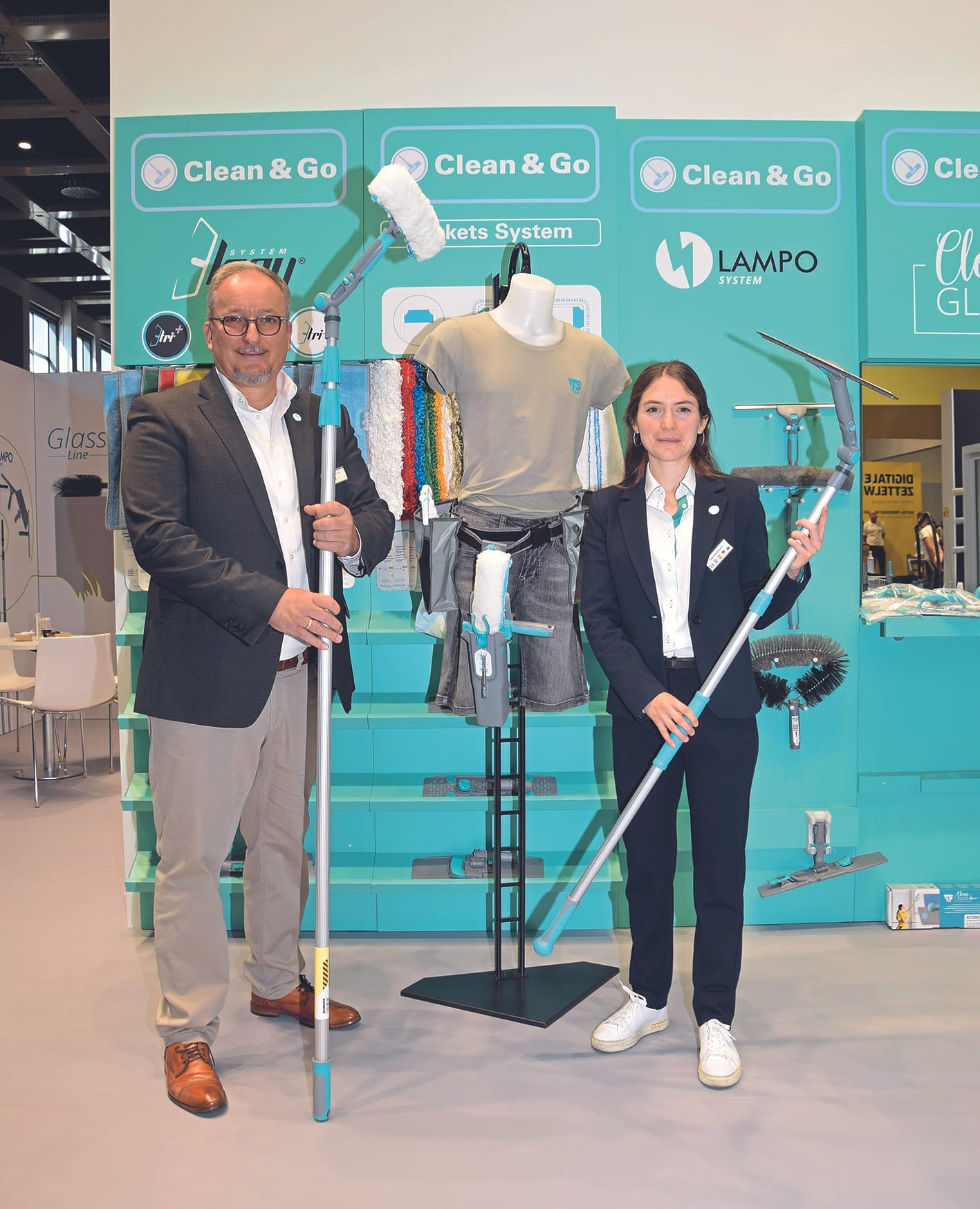 TTS Cleaning: Ein Schwerpunkt war die erweiterte Serie Glass Line mit zahlreichen neuen Werkzeugen für die Glasreinigung, hier gezeigt von Andreas Görres, Vertriebsleiter Deutschland, und Sabrina Salvato (Innendienst). Einwascher (Astro) nebst Bezügen gehören ebenso dazu wie Abzieher (Solaris und Elios aus Kunststoff, Supernova und Nova aus Edelstahl) oder Schaber (Aries). Auch ein Kombi-Werkzeug zum Reinigen und Trocknen (Geminus) steht bereit. Jedes Tool ist mit einem Lampo-Anschluss ausgestattet, der ein schnelles und sicheres Befestigen an Stange oder Stiel beziehungsweise den einfachen Wechsel der Werkzeuge ermöglicht. Ergänzt werden kann das System durch ein spezielles Gelenk (Jack Angled), dessen Neigungswinkel in 15-Grad-Schritten einstellbar ist. Für Arbeiten in größerer Höhe gibt es eine neue Teleskopstange (Lyra) mit Schnellspannringen und internen Modulen mit Endanschlag für eine einfache Längeneinstellung mit einer Hand. In der dreiteiligen Version sind Höhen von bis zu neun Metern erreichbar.