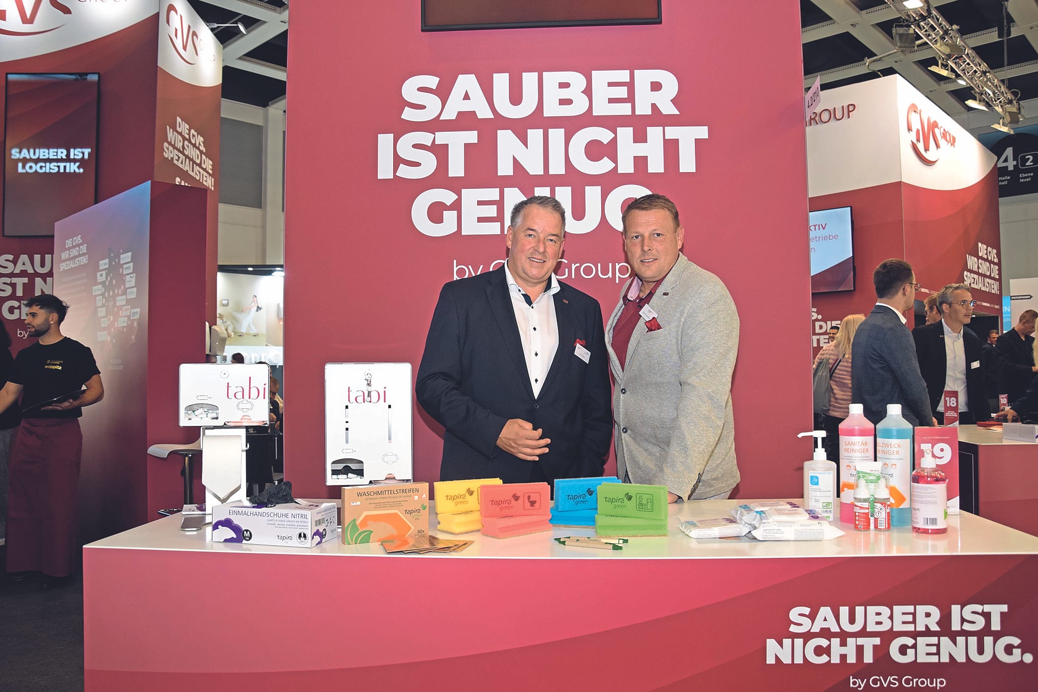 Am Stand präsentierten GVS-Vorstand Jan Butze (li.) und Martin Hoffmann, Leiter Key Account Dienstleister, Industrie & Institutionen, digitale Services und Produkte diverser Hersteller sowie der Eigenmarken Tapira und Desomed. Waschmittelstreifen in nachhaltiger Tapira-green-Ausführung gehörten ebenso dazu wie umweltfreundliche Schwämme mit Sisalpad oder alkoholische Händewaschungs- und Flächendesinfektionstücher. Die Tücher (Aseptosurfix Wipes von Desomed) sind biologisch abbaubar und dürfen auch im WC entsorgt werden.