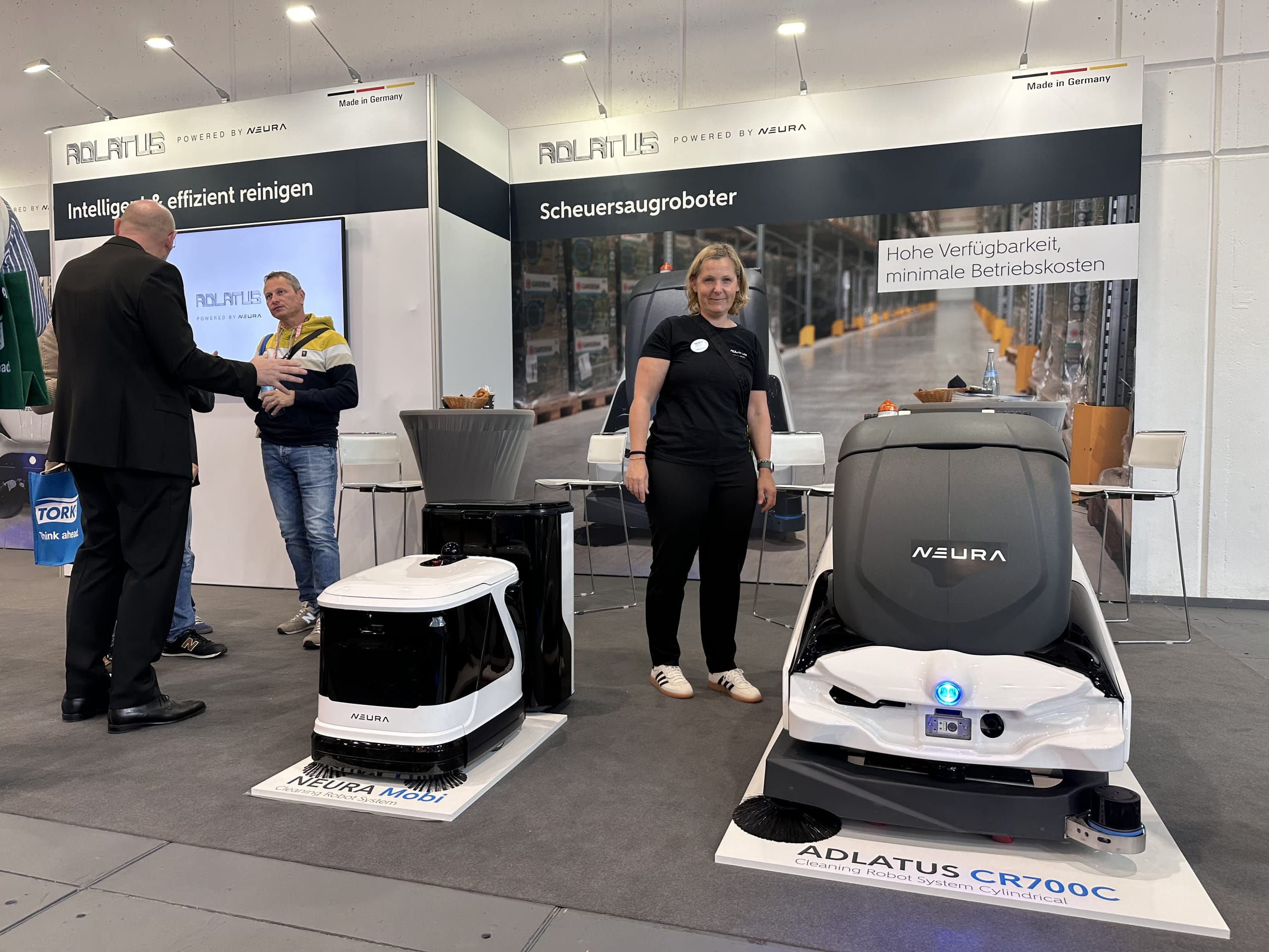 Es gab eine weitere Premiere: Adlatus verkündete eine "Kooperation für die Zukunft der Reinigungsrobotik“. Denn der Spezialist für Reinigungsrobotik und Neura Robotics, Pionier für kognitive Robotik aus Metzingen, haben eine strategische Partnerschaft geschlossen. Ziel der Zusammenarbeit ist es, Innovationen im Bereich der Reinigungsrobotik zu beschleunigen, neue Märkte zu erschließen und Kunden weltweit ein breiteres Lösungsportfolio anzubieten. Die Messe markierte den ersten offiziellen Auftritt. So wurden erstmals die Reinigungsroboter Rumi und Mobi von Neura Robotics gemeinsam mit den Reinigungsrobotern CR700C und SR1300 von Adlatus Robotics in einem Co-Branding präsentiert. Das sei ein bewusstes und sichtbares Zeichen für die enge Zusammenarbeit und zeigt sich nicht nur in einem Neura-Schriftzug auf den Maschinen, sondern auch in einer neuen Farbe: Das bekannte Neongrün von Adlatus ist der Farbe Weiß gewichen wie Petra Ruckgaber (Bild) auf der Messe mit dem Neura Mobi (li.) und dem neuen Adlatus CR700C zeigte. Adlatus bringt Know-how in der Entwicklung und Anwendung von industriellen Reinigungsrobotern sowie langjährige Erfahrung und praxiserprobte Lösungen ein. Gleichzeitig profitiert das Unternehmen von erhöhter Produktionsstärke, internationaler Reichweite und technologischer Ergänzung. "Durch die Kooperation bündeln wir unsere Stärken und können unsere Position in der professionellen Reinigungsrobotik weiter ausbauen. Für unsere Kunden, Partner und Mitarbeitenden ergeben sich daraus zahlreiche Chancen und Vorteile“, erklärt Stefan Erhardt, CEO Adlatus Robotics. Nicht zuletzt soll sich das in einer beschleunigten Produktentwicklung manifestieren sowie in einer Stärkung von Service und Support. "Gemeinsam setzen wir ein starkes Signal für die Zukunft der professionellen Reinigungsrobotik“, betont Dr. Siegfried Hochdorfer, CTO von Adlatus Robotics.