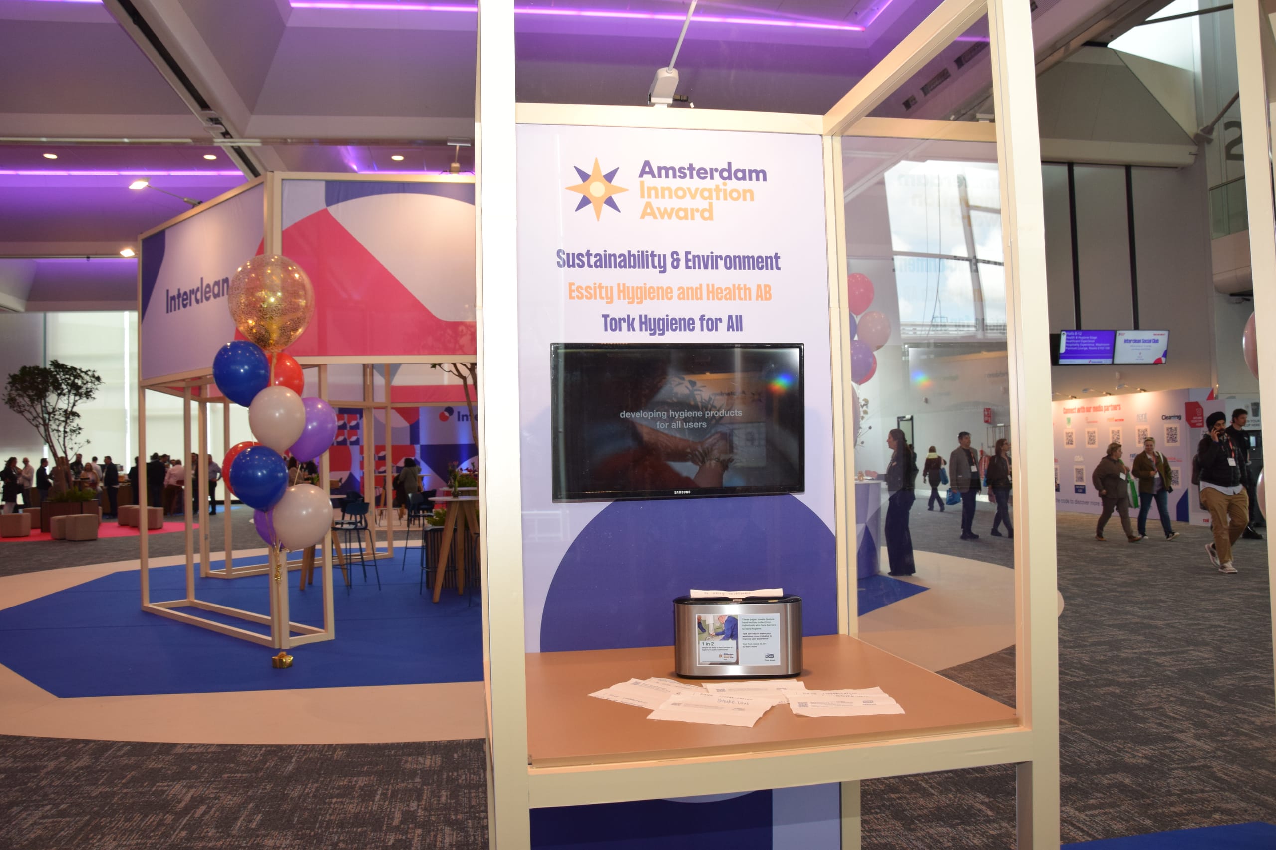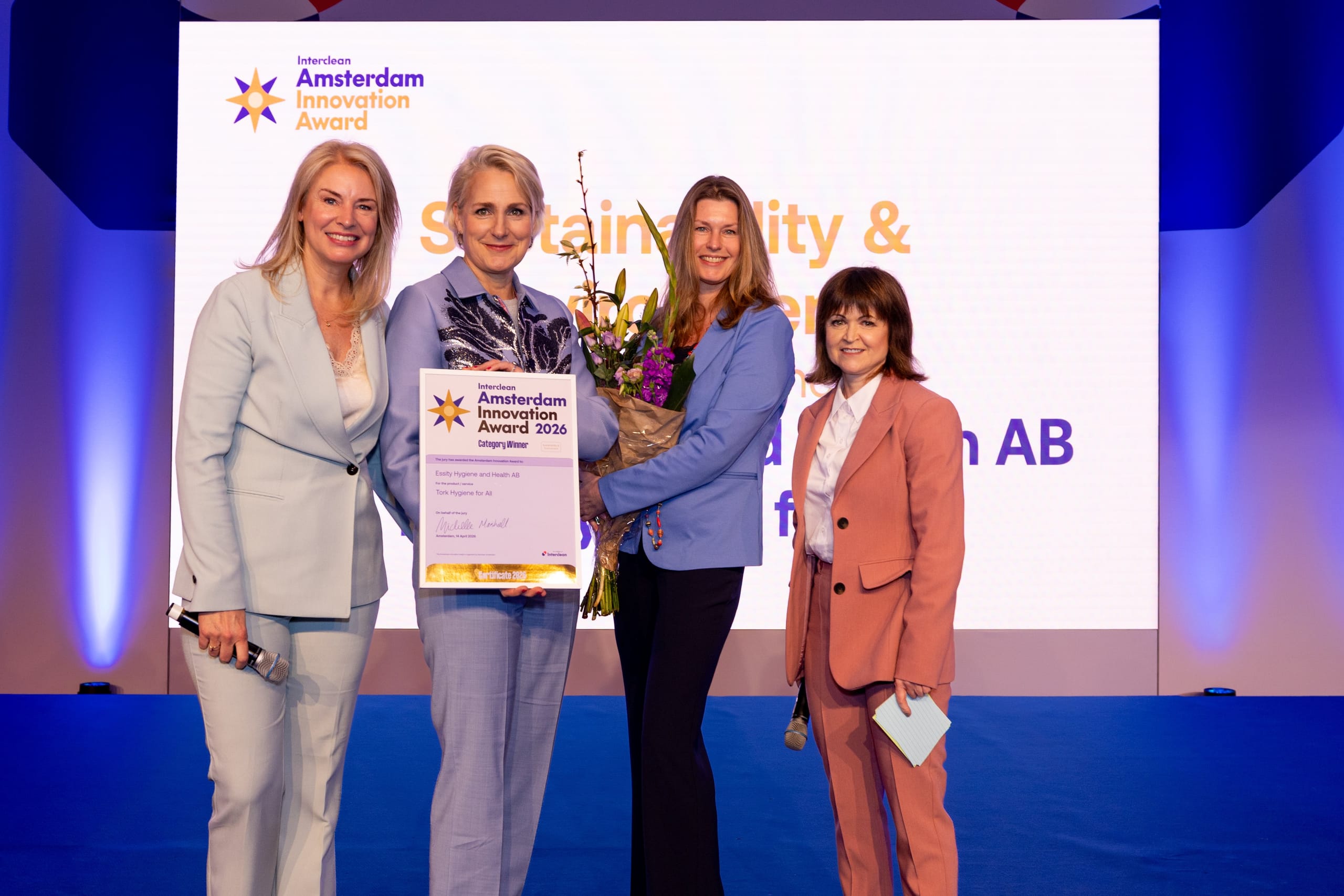 © RAIIn der Kategorie Nachhaltigkeit und Umwelt wurde Essity für eine Initiative zur Förderung inklusiver Hygiene in öffentlichen Waschräumen ausgezeichnet. Zur Preisverleihung waren Anna Königson Koopmans (2.v.li.), Marketing Director, Segment Professionelle Hygiene von Essity, und Reneé Remijnse (2.v.re.), Sustainability Communications Director, gekommen. -