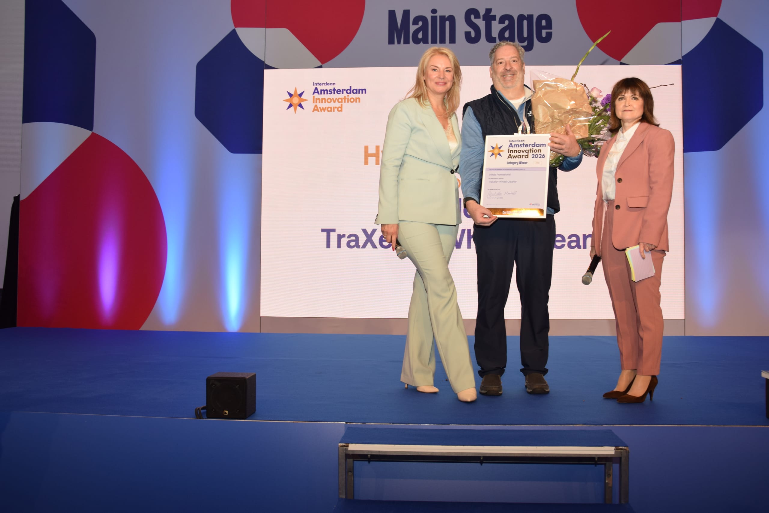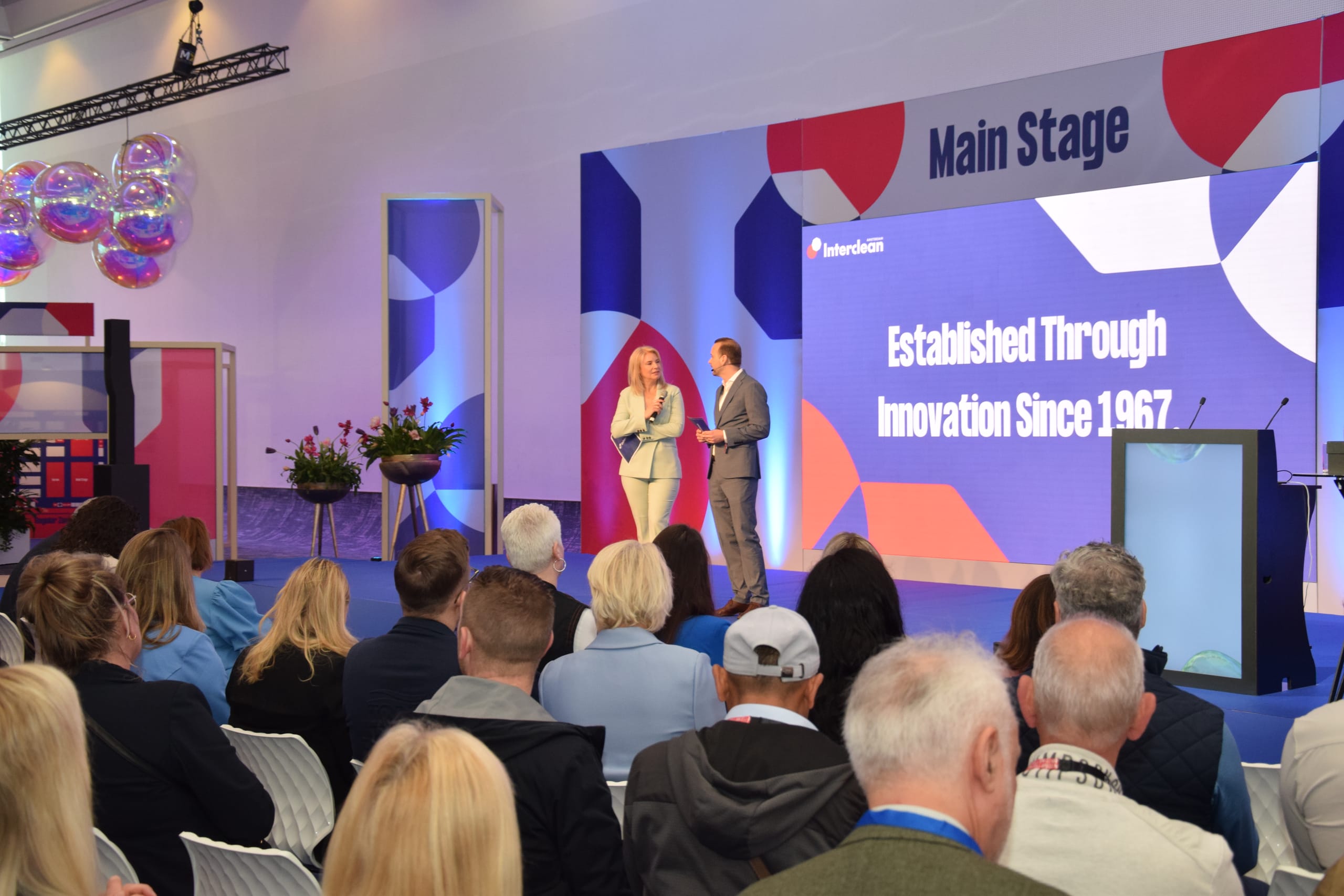 © rationell reinigenDer Innovation Award wurde gleich zu Beginn der internationalen Reinigungsfachmesse Interclean 2026 in Amsterdam verliehen. Moderiert wurde die Veranstaltung von Pernille La Lau, hier auf der Bühne zu sehen mit Interclean-Direktor Robert Stelling. -
