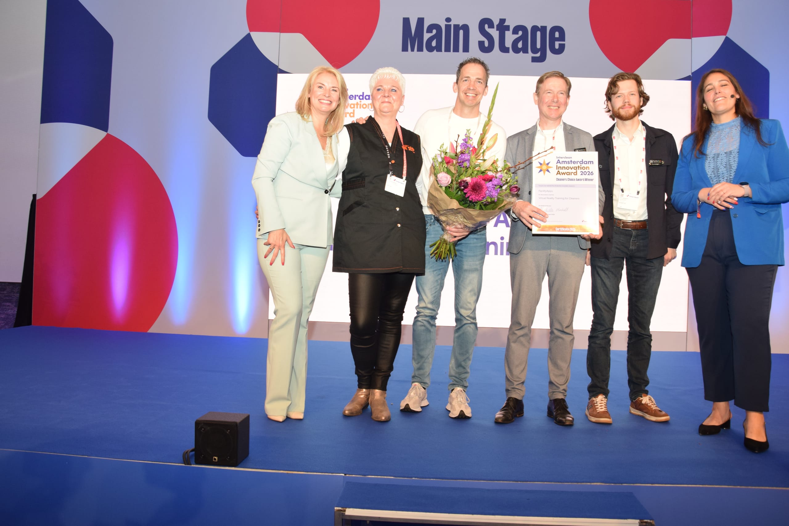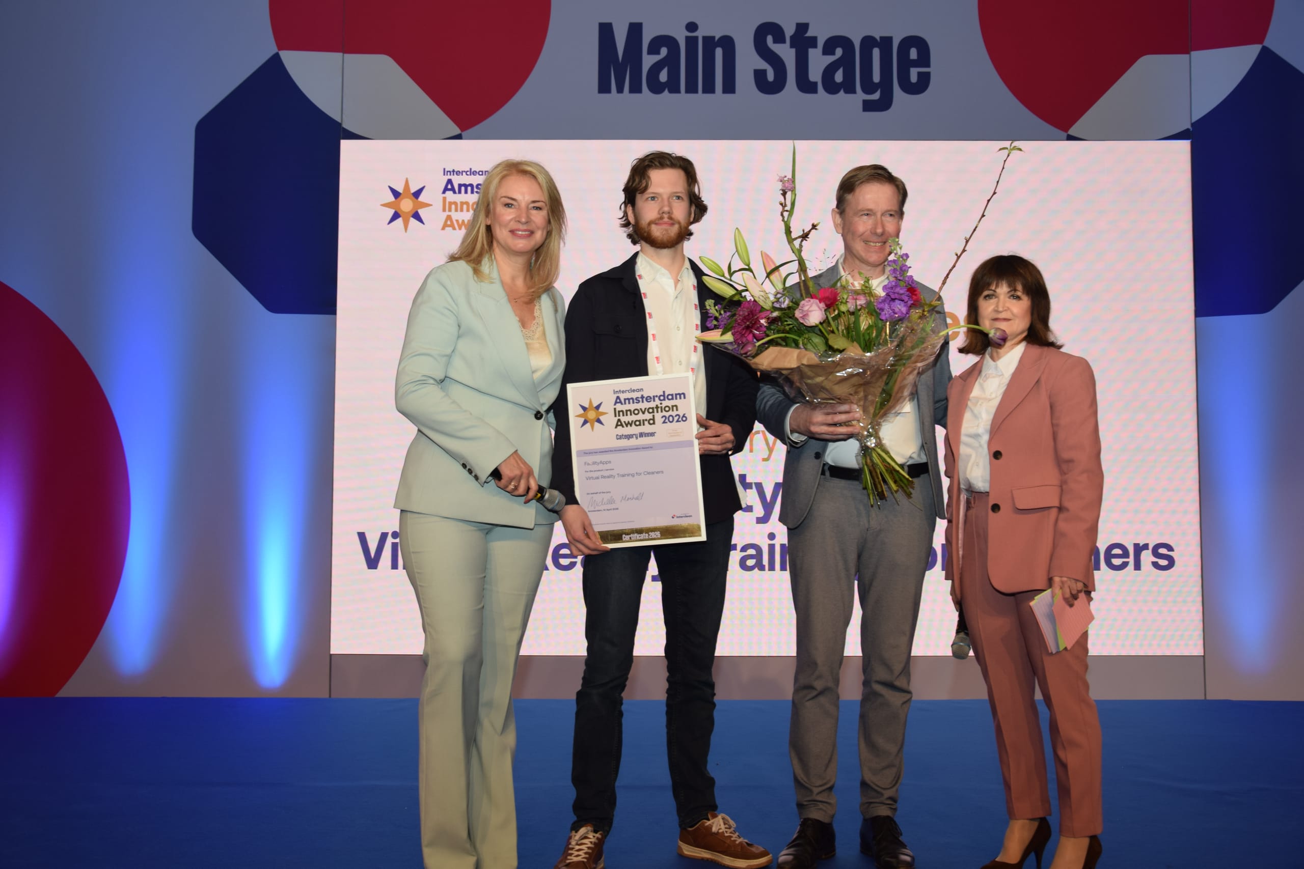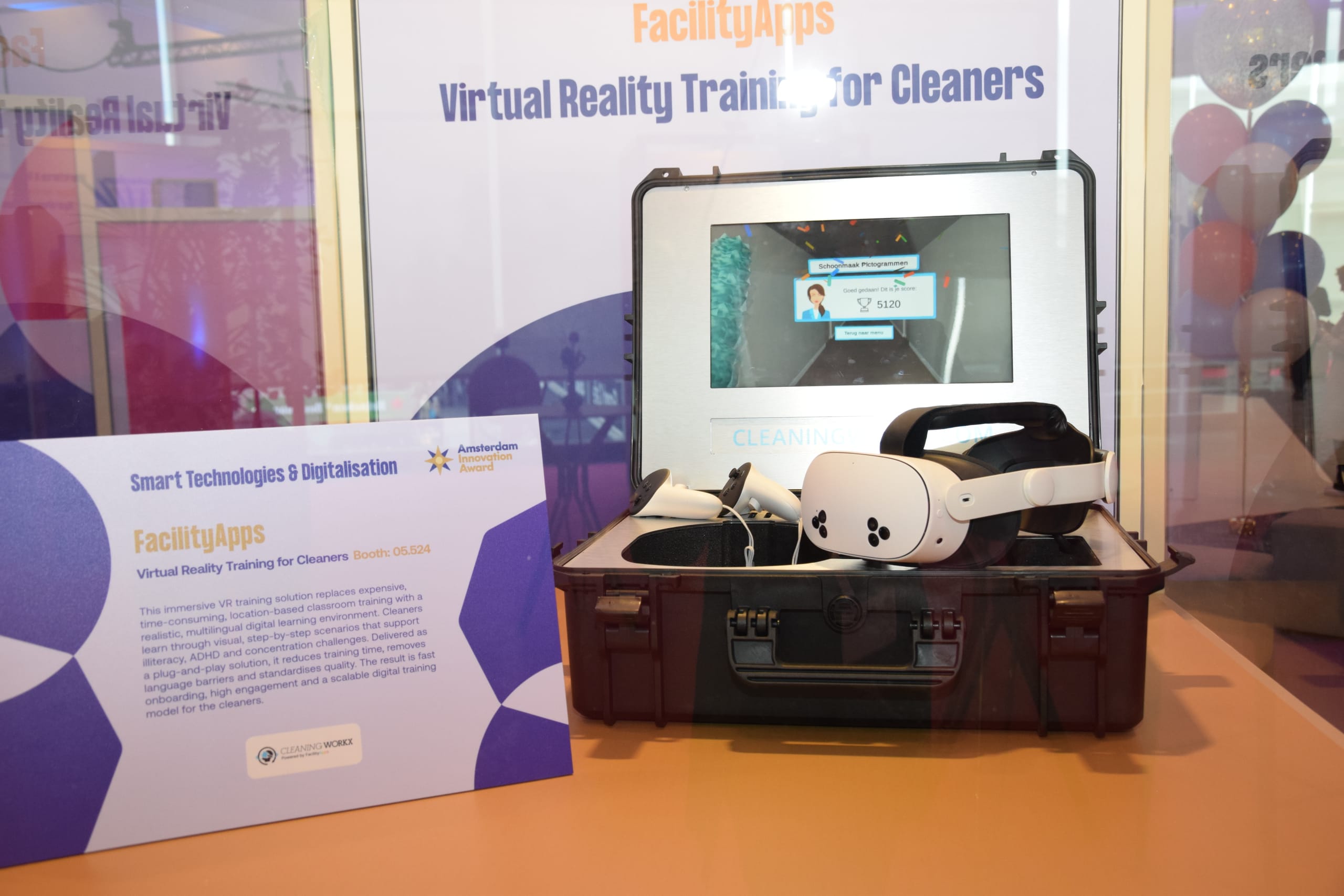 © rationell reinigenMit dem "Cleaners’ Choice Award 2026" wurde das VR-Training von FacilityApps/Cleaning Workx, Sieger in der Kategorie Intelligente Technologien und Digitalisierung, ausgezeichnet. Überreicht wurde der Preis von der niederländischen "Reinigungskraft des Jahres" Jolanda Reedijk-den Heijer (2.v.li.) – an Dirk Tuip, CEO von Facilityapps, Wieland Hendriksen, CEO von Cleaning Workx, und Tim Hereijgers, Entwicklungsleiter von Cleaning Workx.