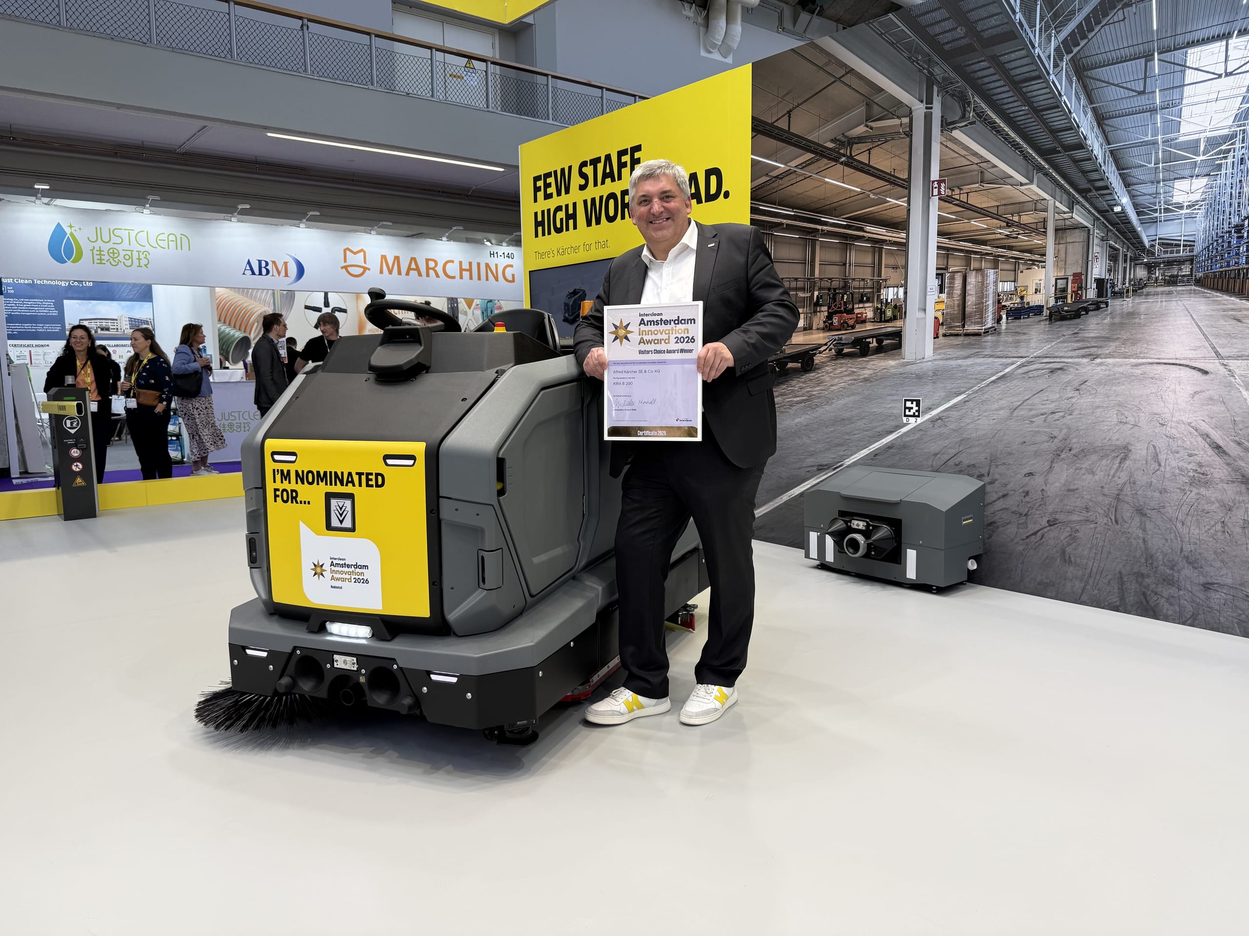 © rationell reinigenDie sicherheitszertifizierte, vollautonome Scheuersaugmaschine, hier an der Seite von Dr. Frank Fuchs, Senior Director im Competence Center Robotics von Kärcher, war in der Kategorie Intelligente Technologien und Digitalisierung nominiert. -
