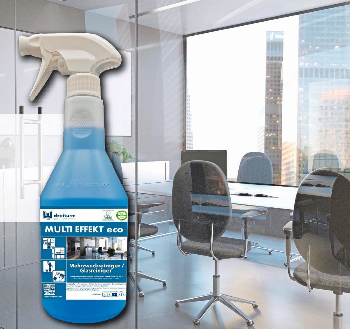 Dreiturm bietet für die tägliche Sprühreinigung den gebrauchsfertigen Mehrzweck- und Glasreiniger Multi Effekt eco in einer handlichen 750-Milliliter-Sprühflasche. Er ist vielseitig auf allen abwaschbaren, glatten oder glänzenden Flächen aus Glas, Acryl­glas (PMMA), Holz, Lack, Metall, Keramik und Kunststoff einsetzbar und eignet sich insbesondere für die Reinigung von Tischen, Schränken, Arbeitsflächen, Türen oder Schreibtischen. Der Reiniger schont glänzende Materialien und trocknet schnell ab, ohne Spuren zu hinterlassen. Das Produkt ist zertifiziert mit dem EU-­Ecolabel (DE/020/388) für ­besondere Umwelt­freundlichkeit und Nachhaltigkeit, ver­zichtet auf ökotoxikologisch belastende Inhaltsstoffe und ist CLP-kennzeichnungsfrei. Eine HACCP-Verkehrsfähigkeits­bescheinigung liegt vor.