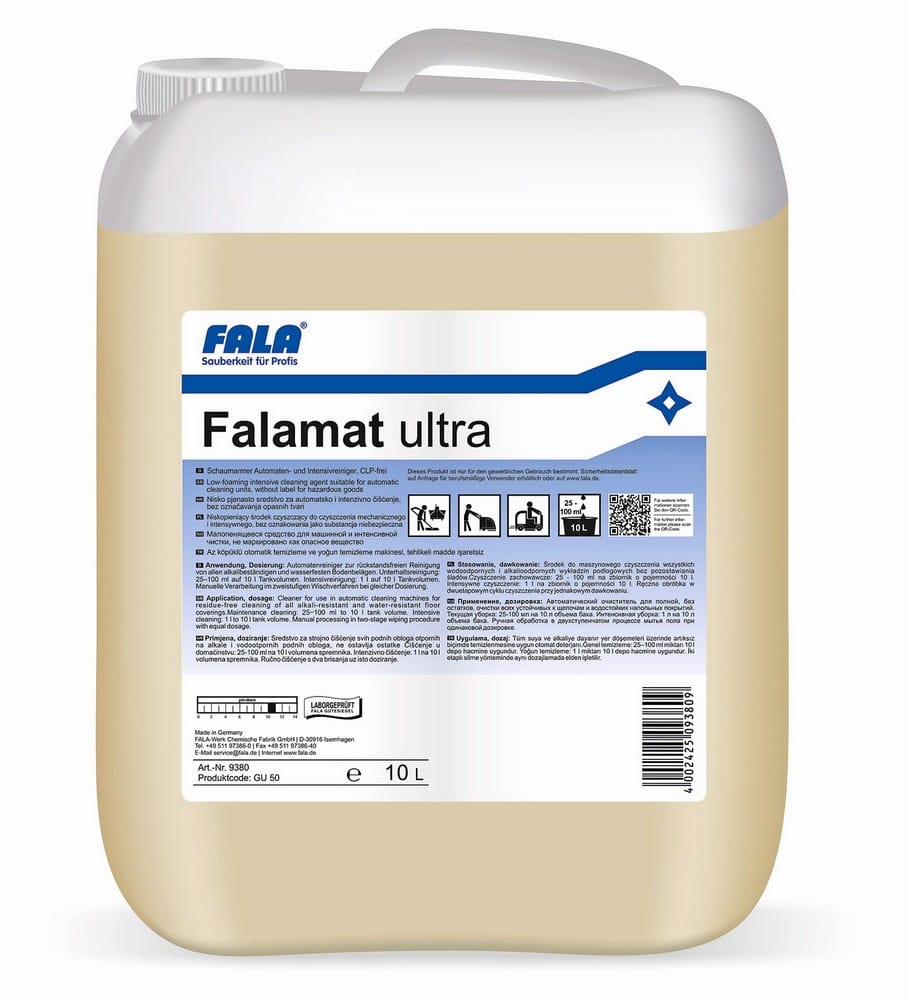 Mit Falamat ultra hat das Fala-Werk einen neuen Automaten- und Industriereiniger mit flexiblen Einsatzmöglichkeiten und hoher Reinigungsleistung entwickelt. Er ermöglicht eine kraftvolle, alkalische Reinigung, die gleichzeitig belagsschonend ist. Die extrem schaumarme Rezeptur reduziert die täglichen Servicezeiten nach Herstellerangaben spürbar. Der Reiniger kann daher unter anderem auf rauen Böden mit dem Scheuersaugautomaten oder der Einscheibenmaschine, aber ebenso auf hochglänzenden Epoxidharzoberflächen eingesetzt werden. Falamat ultra lässt sich sehr variabel dosieren. So kann eine ­geringe und sparsame Dosierung in der Unterhaltsreinigung mit dem Scheuersaugautomaten oder eine konzentrierte Intensiv­reinigung mit der Einscheibenmaschine – bis hin zur gezielten Entfernung von diversen Abriebspuren – flexibel eingestellt werden. Trotz der hohen Reinigungsleistung ist bei Falamat ultra ­keine Gefahrstoff-Kennzeichnung nach der CLP-Verordnung erforderlich. Die dezente Beduftung des Reinigers macht die Verarbeitung angenehm und reduziert die Belastung durch starke ­chemische Gerüche.