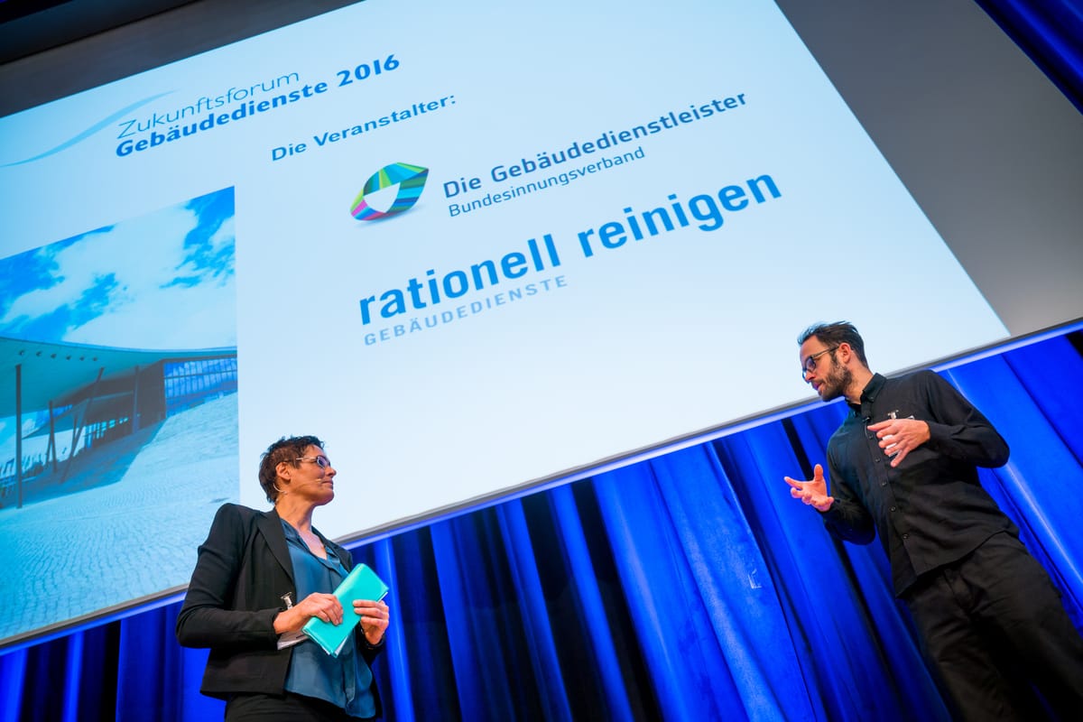 © André Wirsig/rationell reinigenGebäudedienste 2030: Worauf müssen sich Unternehmer im Gebäudereiniger-Handwerk einstellen und wie kann es gelingen, auch künftig erfolgreich zu bleiben? Zahlreiche Referenten - hier zu sehen: Daniel Domscheit-Berg mit Moderatorin Andrea Blome - gaben Antworten. -