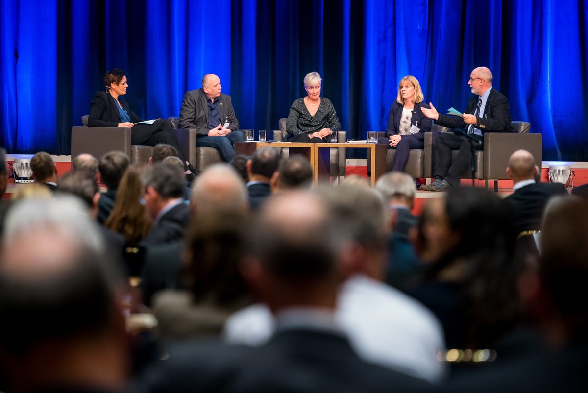 © André Wirsig/rationell reinigenWas ist heute schon möglich? Wie könnte es morgen aussehen? Moderatorin Andrea Blome fragte nach - bei (v.li.) Bundesinnungsmeister Thomas Dietrich (BIV), Michael Gamtofte (VDMA) und Dr. Thomas Schnell (IHO). -