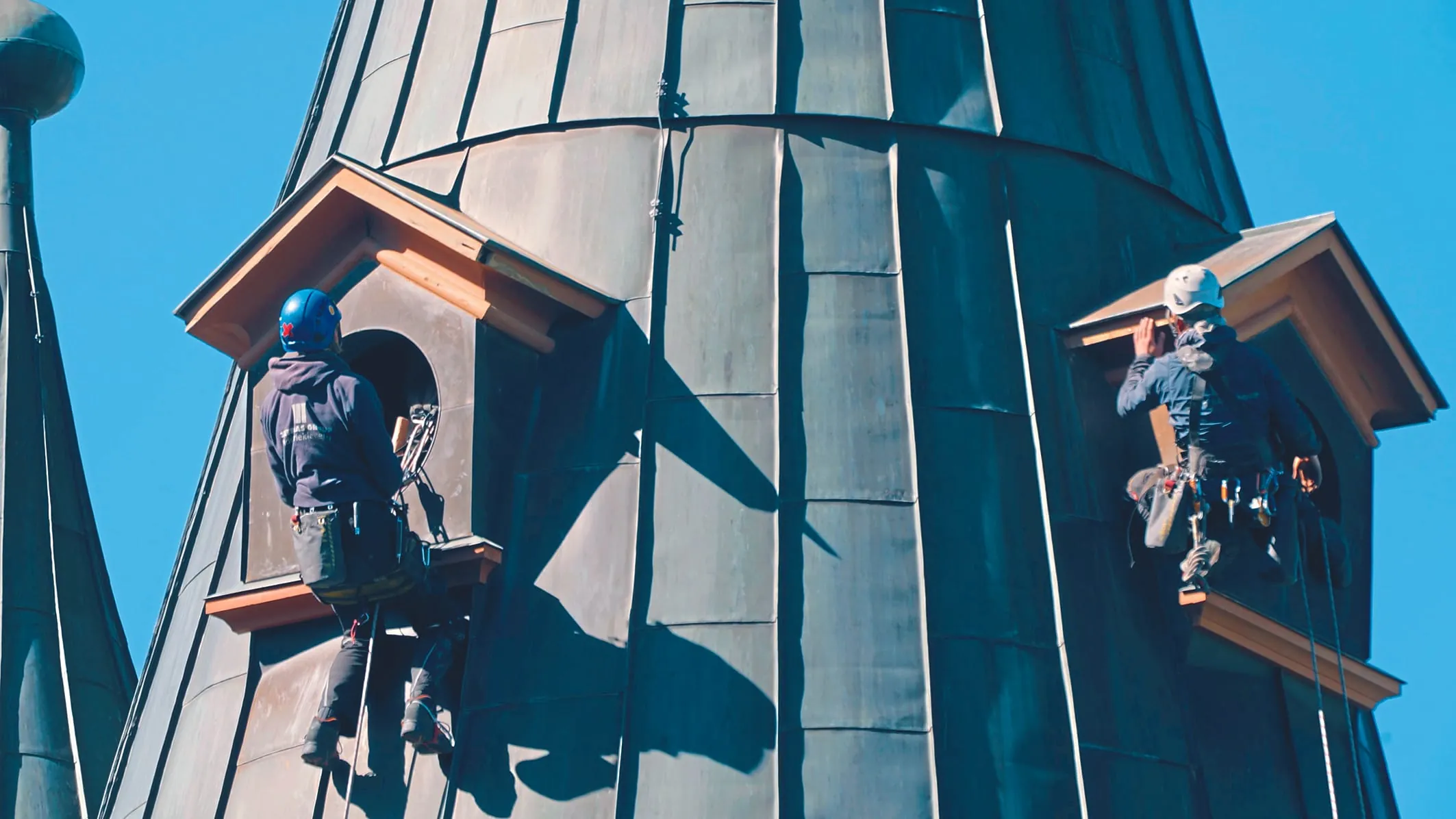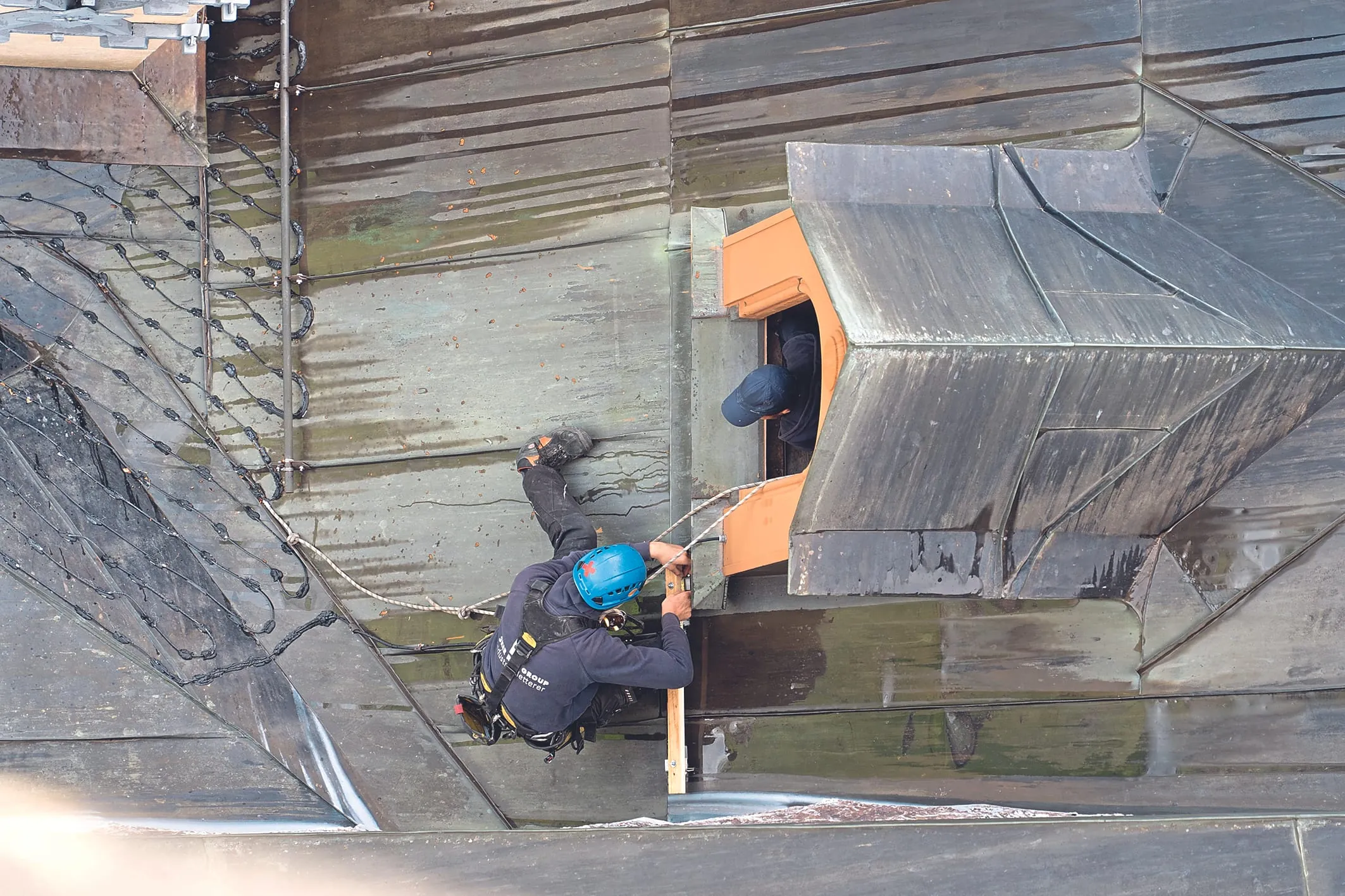 In den nächsten Schritten trugen die Kletterer auf jede Gaube in Etappen zwei Schichten Grundierung sowie drei Deckanstriche auf. Die verwendete Leinölfarbe erfordert zwischen jedem Anstrich rund 24 Stunden Trocknungszeit. Dabei setzte 3KER RAS bewusst auf ein Zwei-Mann-Team, mit dem ein Arbeitsrhythmus ohne Wartezeiten möglich war. Neben den Absprachen und dem Abbinden der Farbe wirkten sich auch die Wetterverhältnisse auf die Sanierungsarbeiten aus. "Bei starkem Regen können wir beispielsweise nicht streichen. Herausforderungen wie diese verzögern mitunter unsere Arbeiten und erfordern spontane Lösungen", merkt Martin Semmel dazu an.