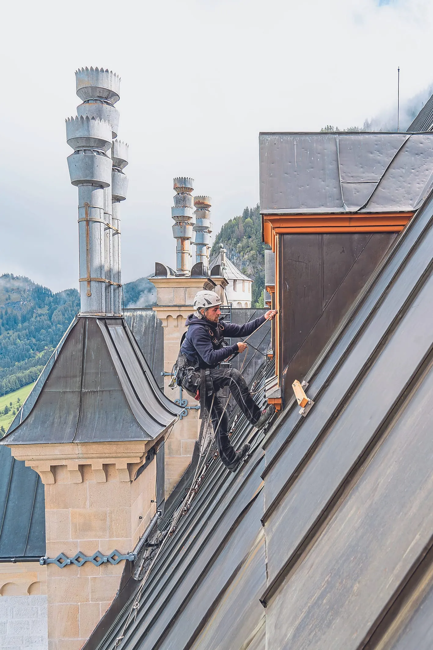 Ihren Einsatzort in luftiger Höhe erreichten die Industriekletterer von innen durch die Fenster. Dazu befestigten sie zunächst Sicherungsseile am robusten Dachstuhl und hängten sich anschließend in ihrer Kletterausrüstung zu den Gauben hinaus. Um einen kontrollierten Stand zu haben, bauten sie sich mit Klemmen und Hölzern stabile Tritte. Martin Semmel, Geschäftsführer der 3KER RAS Group, erklärt: "Das Schloss Neuschwanstein hat ein Blechdach mit Stehfalzdeckung und einer Steile von mehr als 45 Grad. Darauf kann niemand sicher stehen. Bei Arbeiten an schwerzugänglichen Gebäuden wie diesem müssen wir immer wieder kreative Lösungen finden."