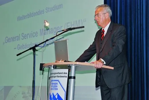 Auf Initiative der Mitgliedsunternehmen und des Bundesinnungsverbandes ist ein neues weiterbildendes Studium zum General Service Manger (FHM) ins Leben gerufen worden, den Prof. Dr. Wolfgang Krüger (Fachhochschule des Mittelstands, Bielefeld) vorstellte. Mit diesem neuen Ausbildungsgang soll der Entwicklung der Unternehmen des Gebäudereiniger–Handwerks und den zukünftigen Anforderungen an Führungskräfte Rechnung getragen werden. Die werden in fachlicher, aber auch in gewerksüberschreitender und betriebswirtschaftlicher Hinsicht deutlich steigen. Das berufsbegleitende Studium umfasst sechs Hauptmodule, nach 18 Monaten und erfolgreicher Prüfung erhalten die Absolventen das Zertifikat General Service Manager (FHM).