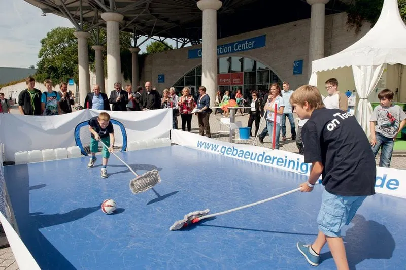 Gebäudereinigermeister Thomas Schmoldt zeigte während des Interviews in luftiger Höhe an einer gegenüberliegenden Glaswand seine Reinigungsfähigkeiten als Fassadenkletterer. Geschick und Cleverness sind dabei vor allem gefragt. Abgerundet wurde die coole Cleaner-Show durch Mpolo und Nos, die ihre Gebäudereinigersongs in die Mikros rappten. Kein Wunder, dass die jungen Besucher erstaunt waren. „So habe ich den Job nie gesehen“, sagte der 14-jährige Tom. „Da steckt mehr dahinter, als ich gedacht hatte.“ Svenja (15) geht sogar noch einen Schritt weiter: „Ich werde mich mal genauer erkundigen, der Job scheint Spaß zu machen.“ Die Landesinnung Niedersachsen des Gebäudereiniger-Handwerks lud neben der Bühne täglich zum Mopp-Hockey ein. Sehr zur Freude der vielen Kids, die in einer langen Schlange auf ihr Spiel warteten. Auch dabei wurden auf spielerische Art Informationen vermittelt.