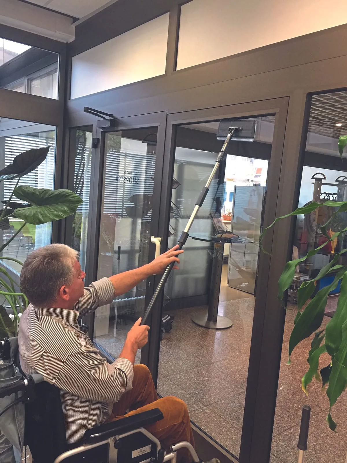 An den Teleskopstiel muss beispielsweise ein Kugelkopfgelenk, an den Rollstuhl eine Halterung für das Arbeitsgerät. Für "Integral Reinigen" hat Cornel Klaßen in der Firma Vermop einen Mitstreiter rund ums Moppen gefunden, und er verspricht: "Das Material muss sich dem Menschen anpassen und da sind wir noch nicht am Ende". Der Teleskopstiel ist ein Vermop-Standardgerät, der "Scandic X Stiel" mit einer drehbaren Kugel als Kopf, damit sich der Mopp flexibel bewegen lässt. Er ist wegen seiner ergonomischen Bauweise über die Berufsgenossenschaft der Bauwirtschaft (BG Bau) förderfähig.