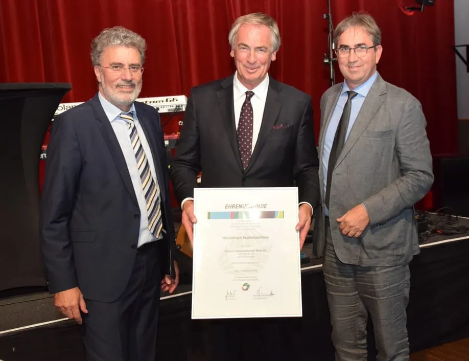 Bernhard Nordhausen (li.), Geschäftsführer des Landesinnungsverbands Nordrhein-Westfalen, und Jens Breer, Obermeister der Innung Ruhr-Wupper-Südwestfalen, überreichten Thomas Dietrich die Ehrenurkunde zum 100-jährigen Bestehen des Unternehmens.
